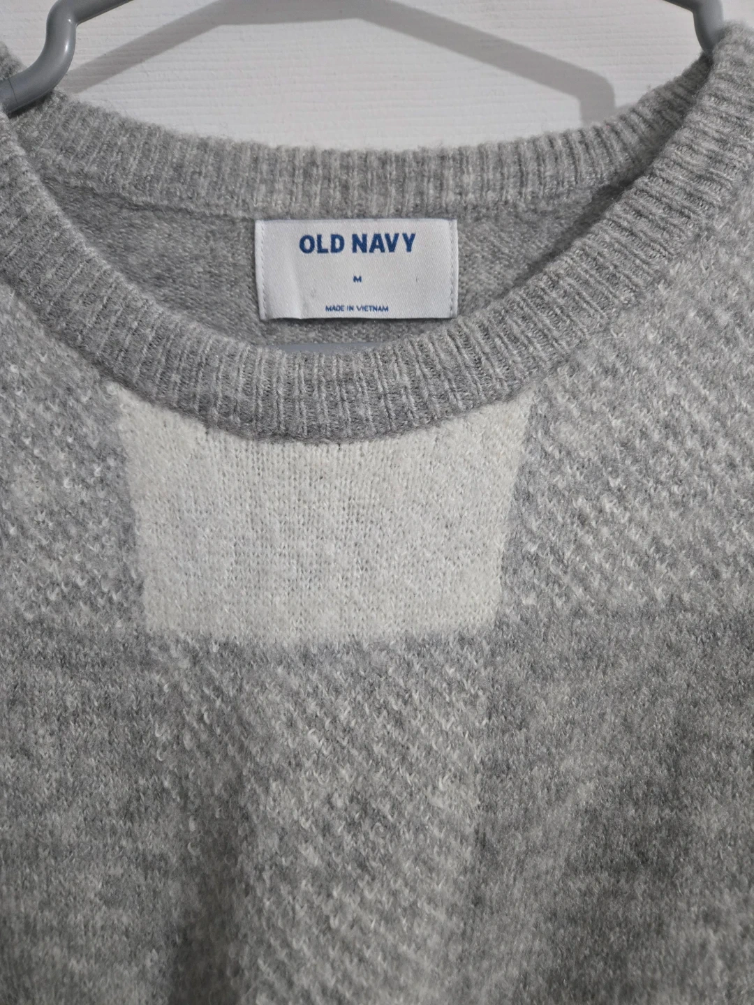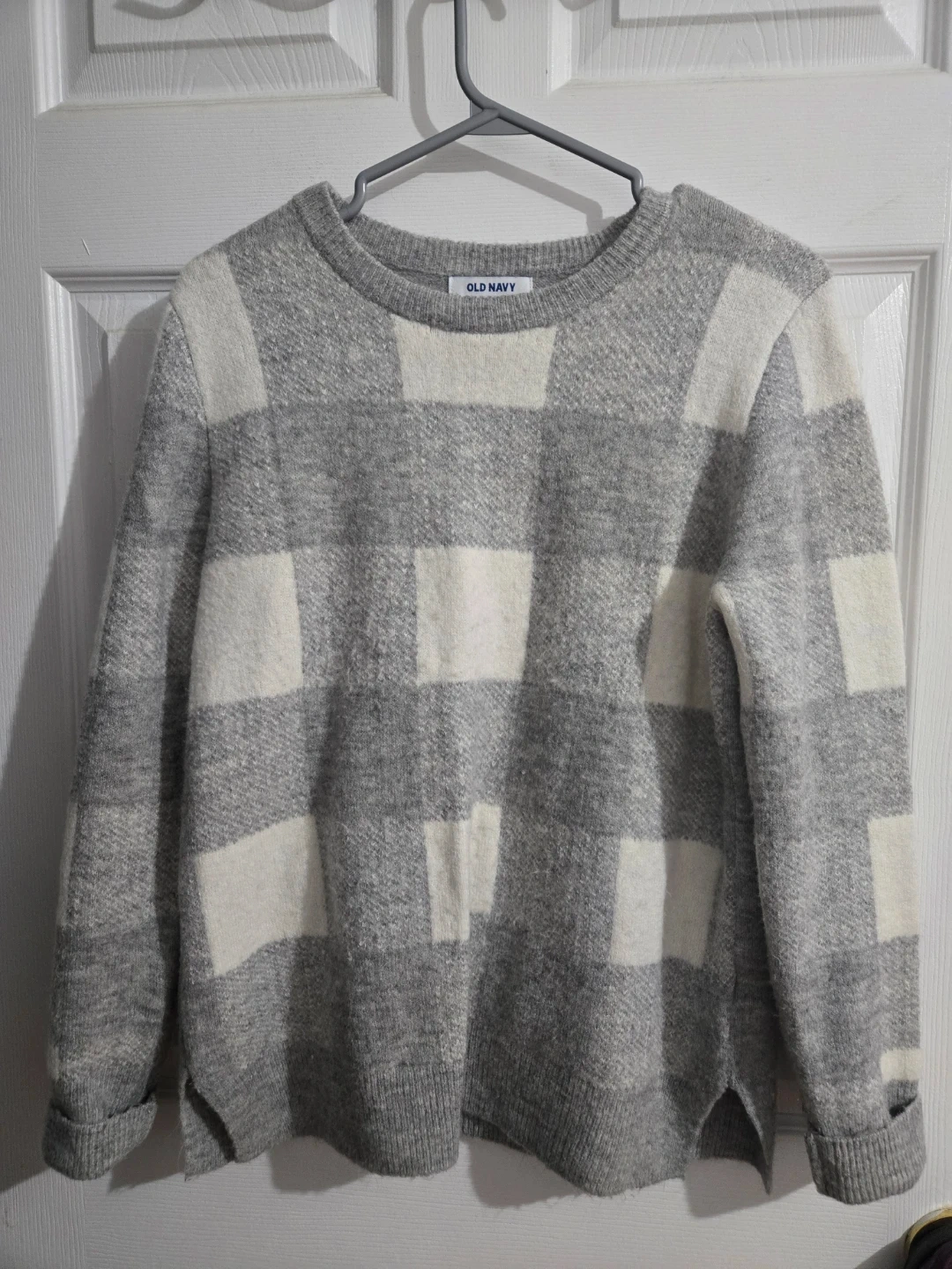 This Old Navy sweater features a classic grey and white plaid pattern. It's a size medium with a comfortable fit. Perfect for staying cozy during cooler weather!