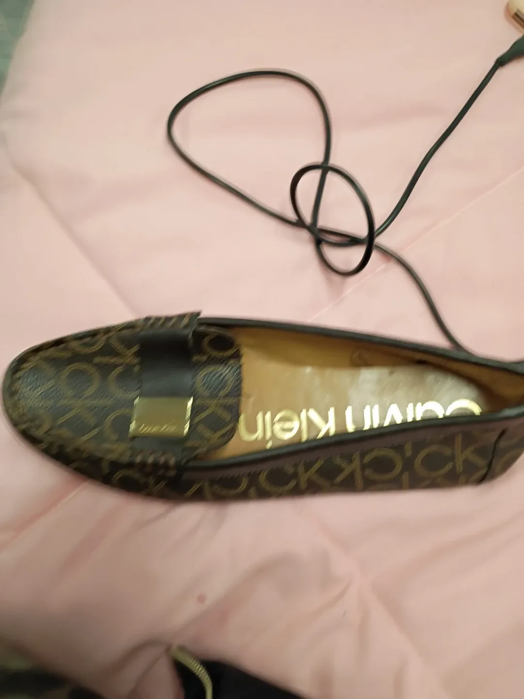 Women's Calvin Klein loafers with all-over monogram print. Features a classic loafer silhouette with a decorative buckle accent. Brown monogram pattern.