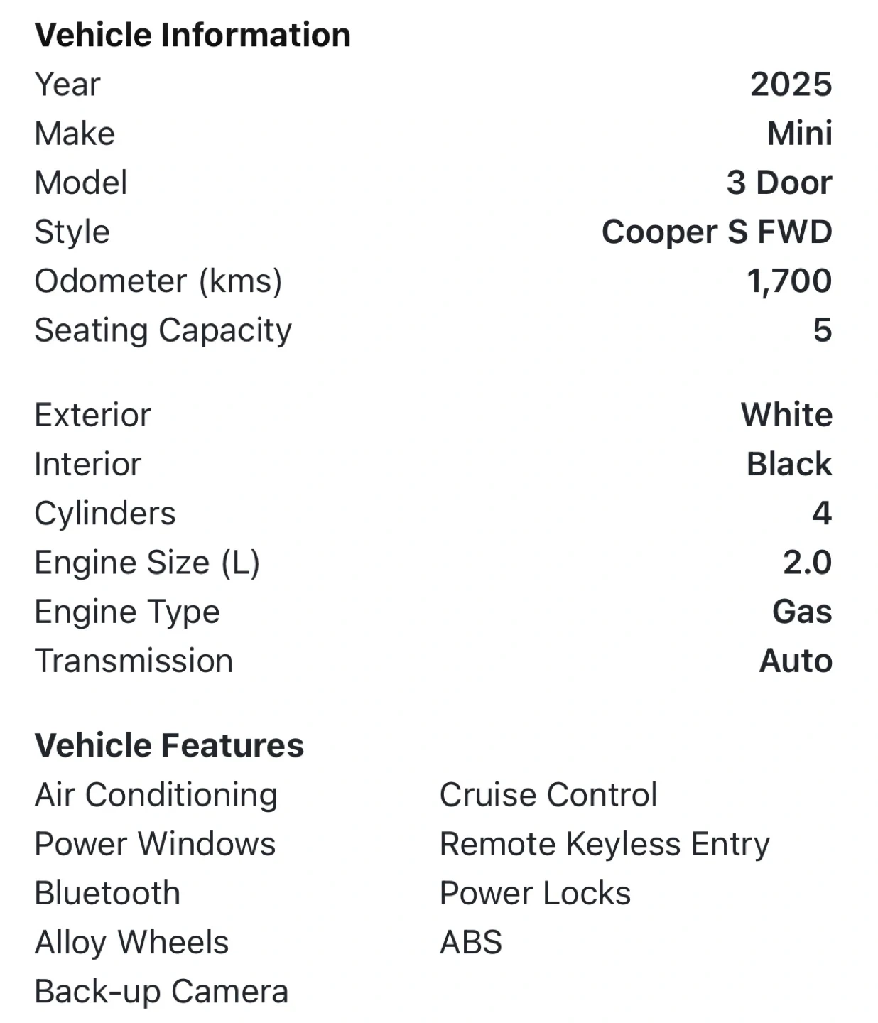 Lease Transfer: White Mini Cooper S (only 1700km)