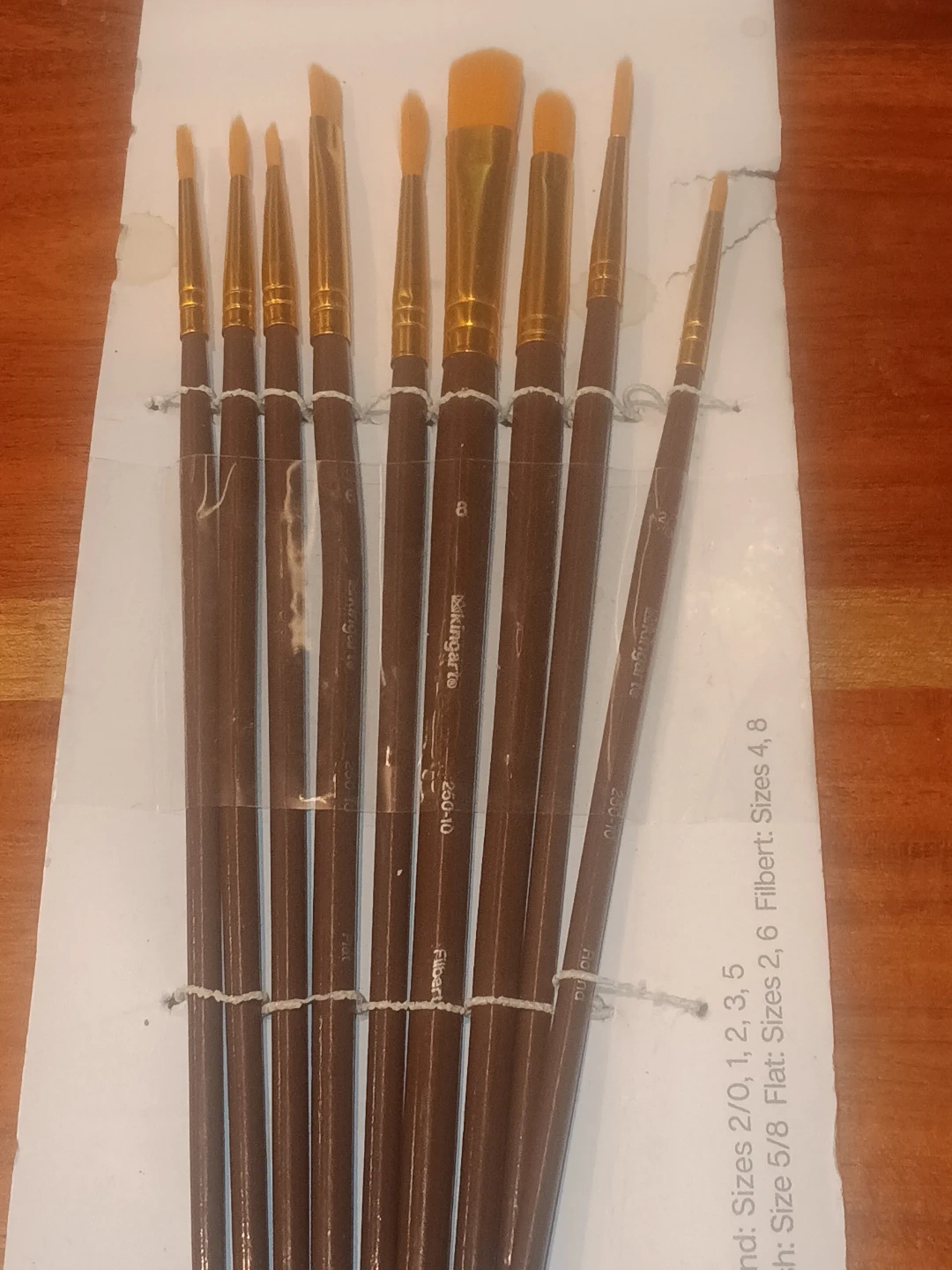 This is a set of 9 Kingarto art brushes. Included are round brushes in sizes 2/0, 1, 2, 3, 5. Also included are a size 5/8 flat brush and sizes 2, 6 Filbert brushes.
