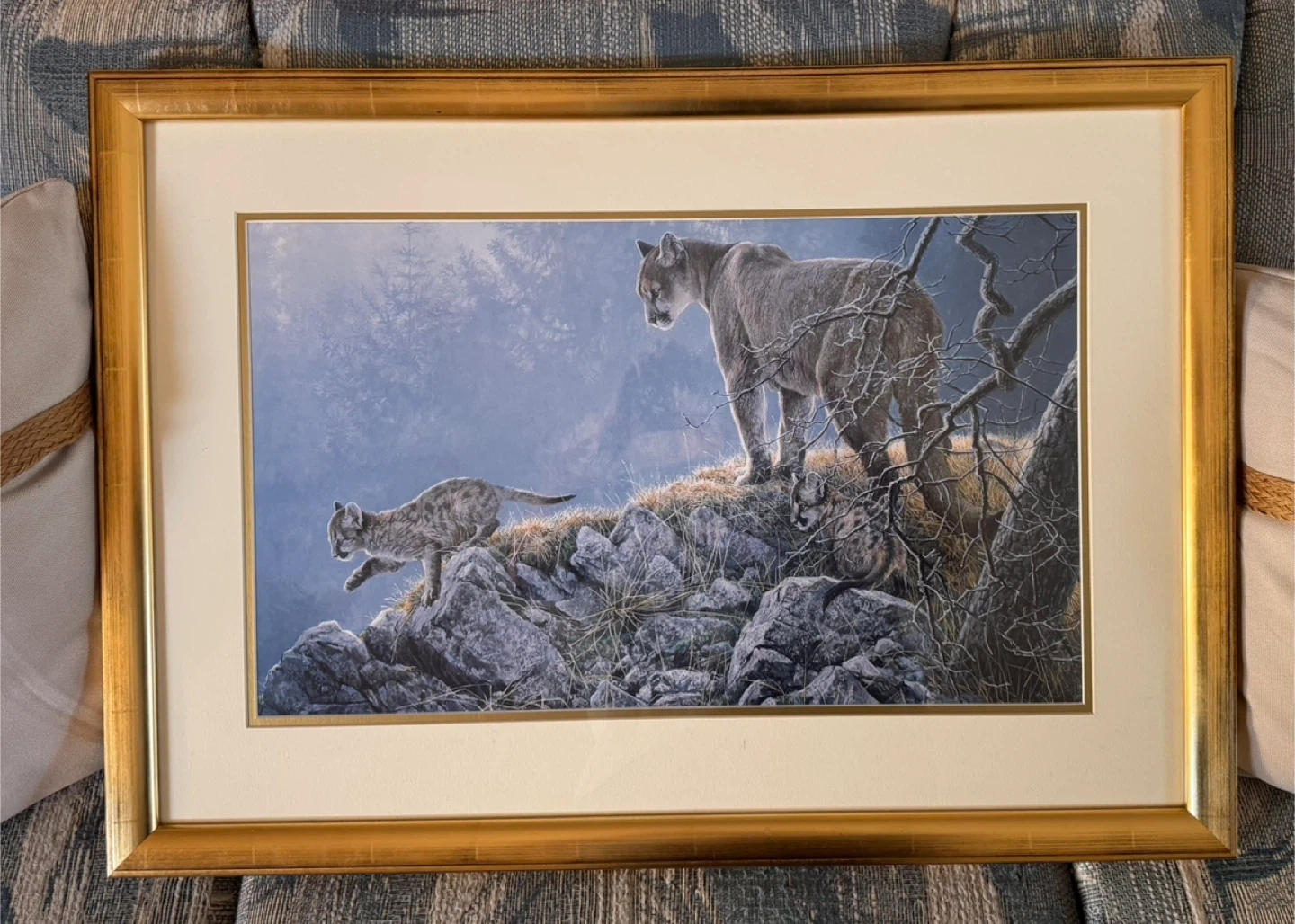 Robert Bateman's 1997 Excursion - Cougar & Kits painting. It is not a numbered copy, we think it is a framed poster nicely done in a gold wooden frame by Janet's Custom Framing in Vancouver.