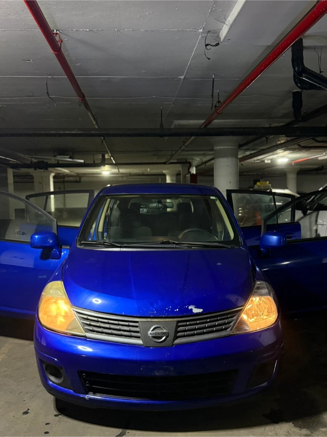 Selling a blue Nissan Versa hatchback. It shows signs of use. The car is great, it doesn't need anything for safety, new battery, new oil change, new spark plug, new coil, new engine ears, and new exhaust system, I just bought winter wheels, I can negotiate the price.