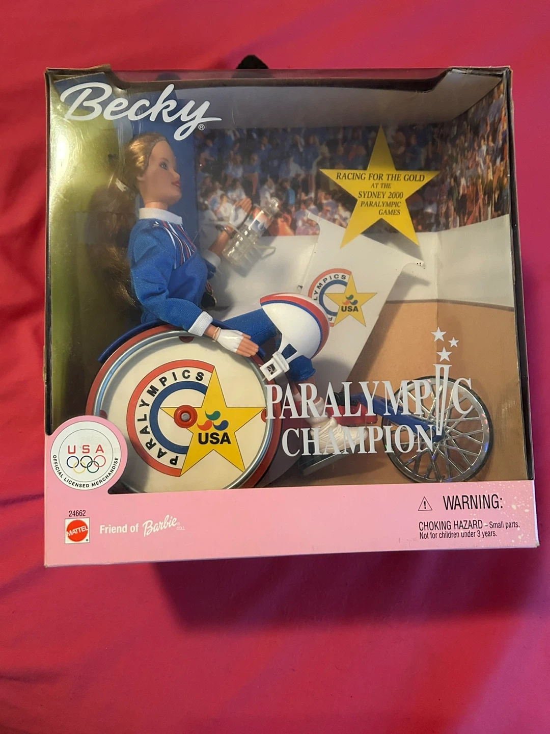 This is the Barbie "Paralympic Champion" Becky doll, friend of Barbie. It's from the 2000 Sydney Paralympic Games. Includes wheelchair and racing attire.