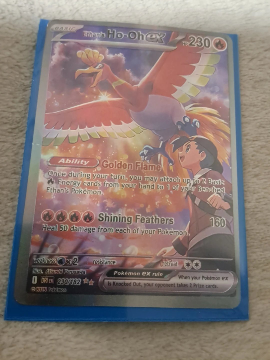 This is Ethan's Ho-Oh EX Pokémon card, part of the 230/182 set. It features the 'Golden Flame' ability and 'Shining Feathers' attack. The card has 230 HP and was printed in 2025.