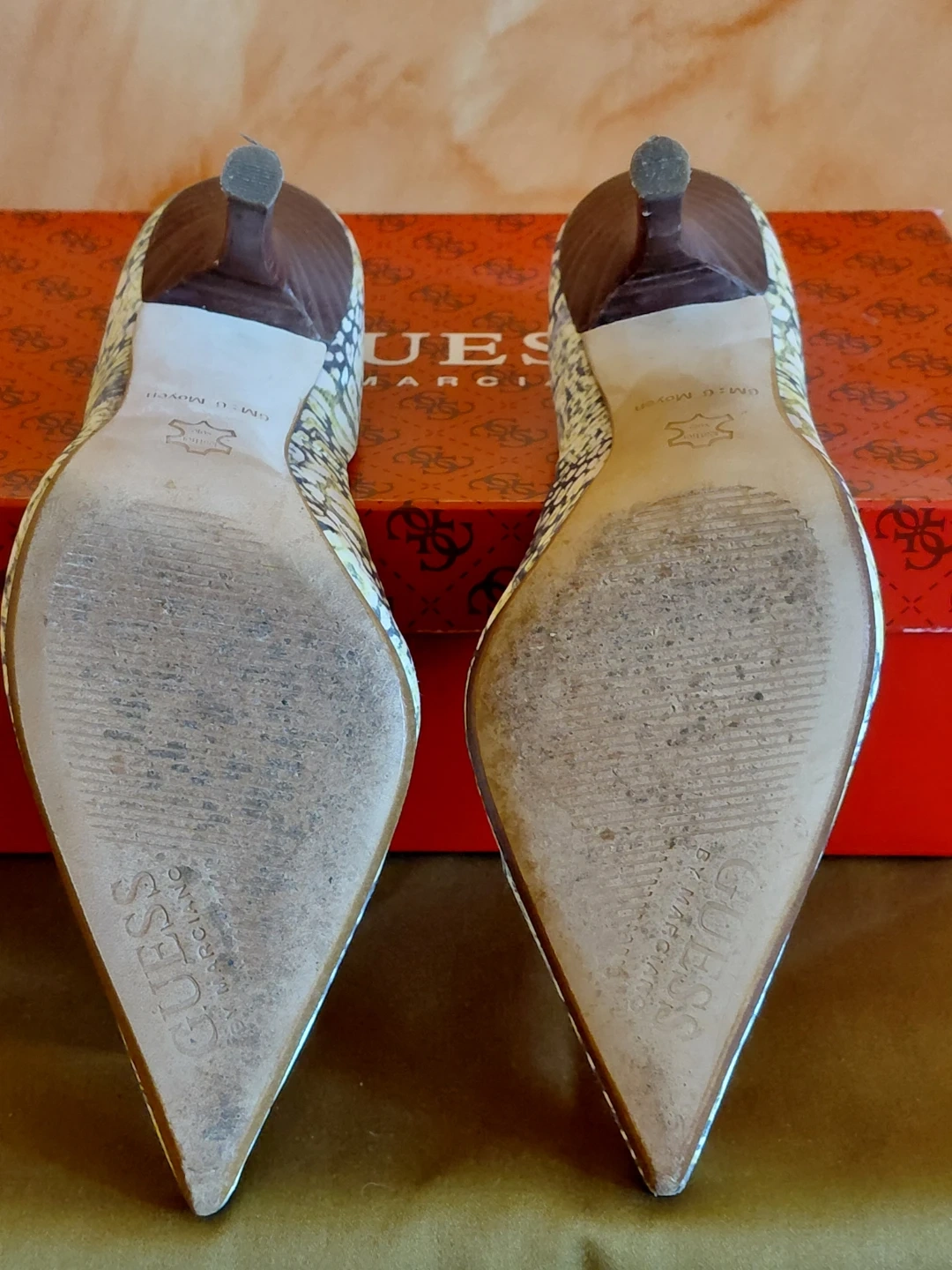 Guess By Marciano women's high heel pumps in a snakeskin print. Features a pointed toe and stiletto heel. Includes original box.