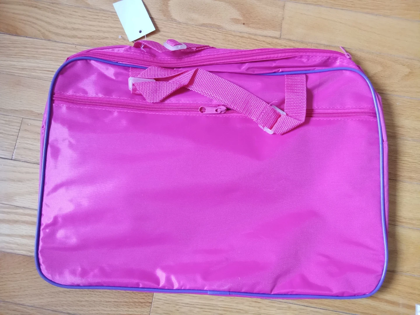 This pink bag features Elsa and Anna from Disney's Frozen. It has a zippered main compartment and two carrying handles.