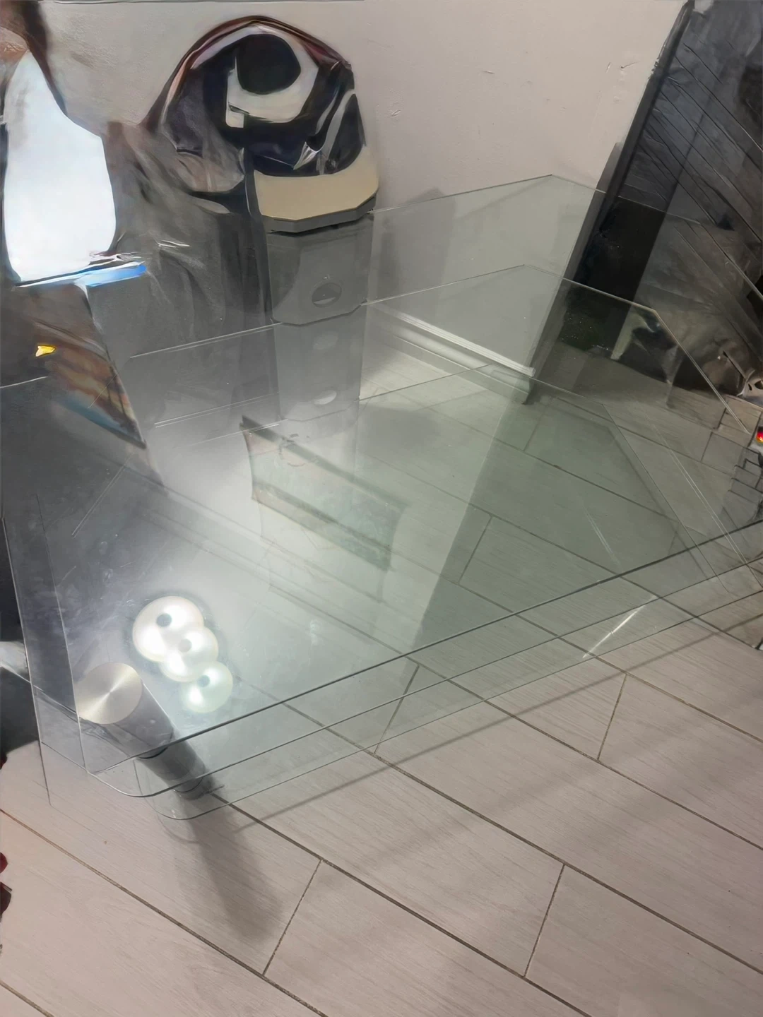 This is a three-tier glass TV stand with metal legs. It offers ample space for your entertainment devices. The clear glass and silver metal construction complement modern decor.