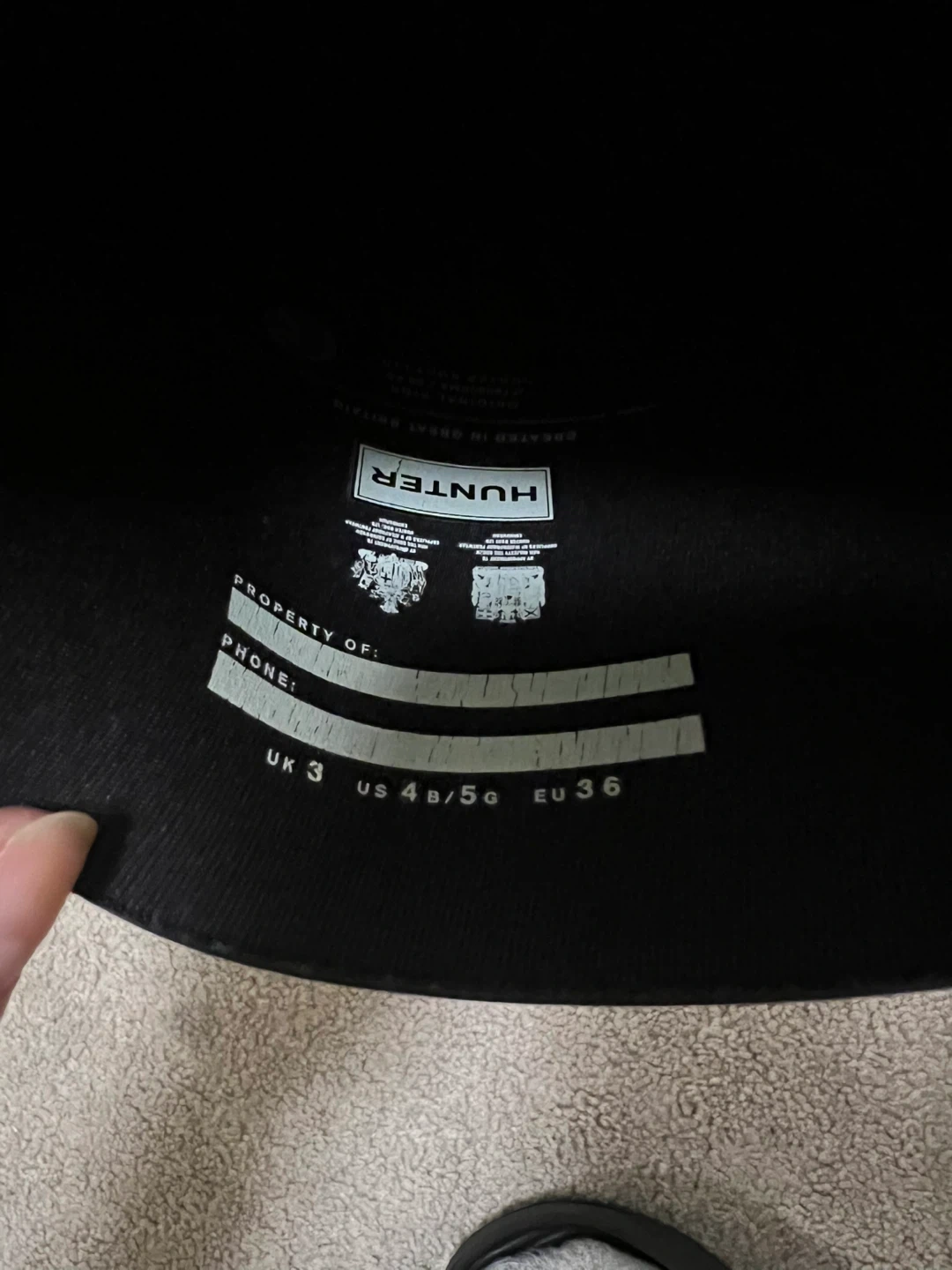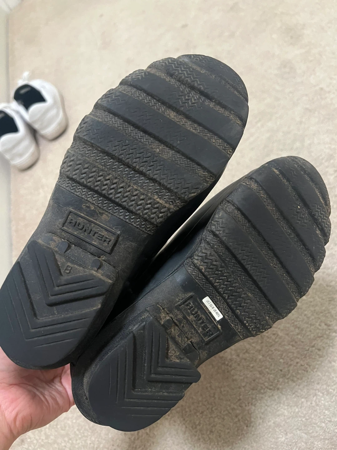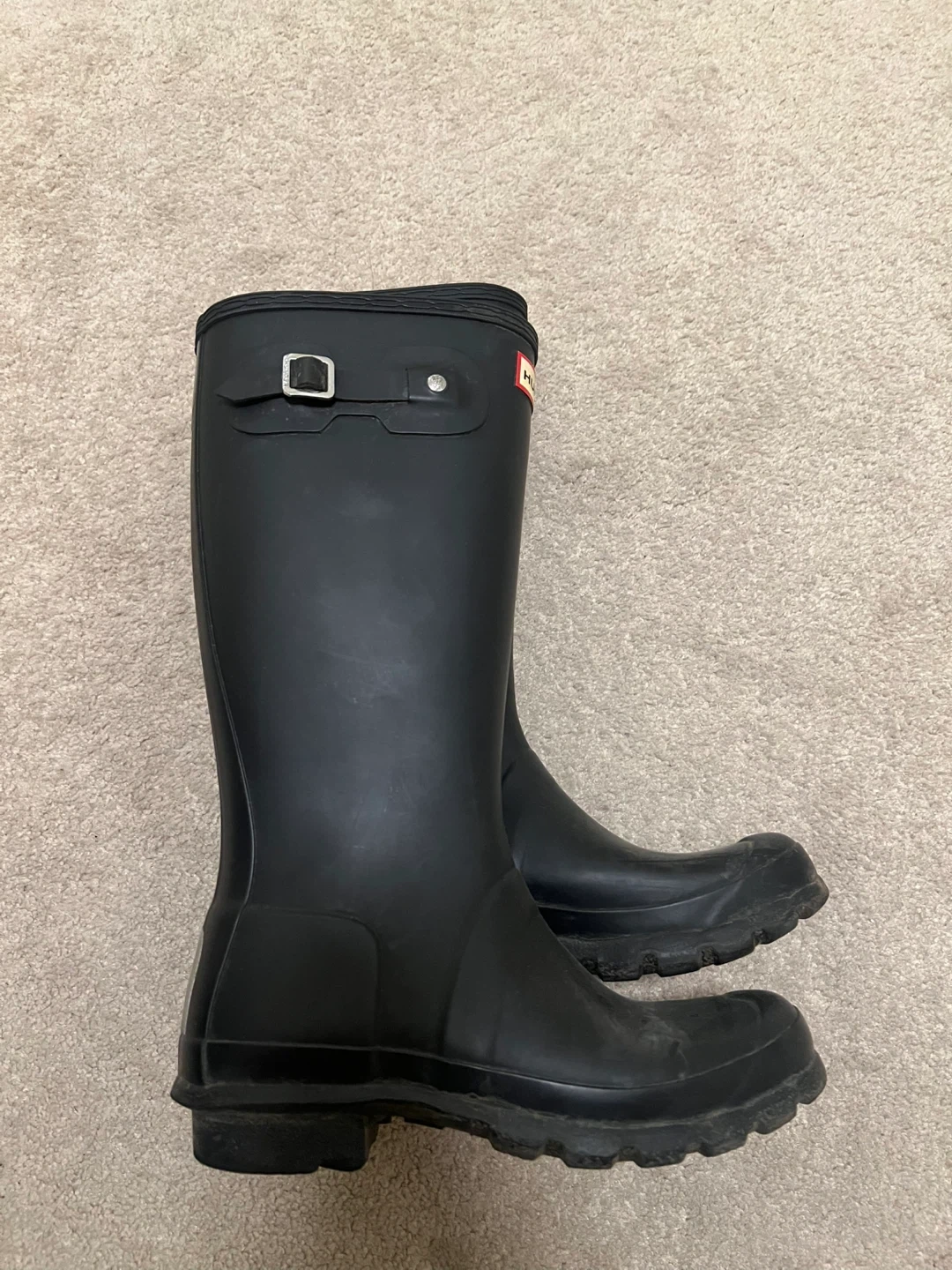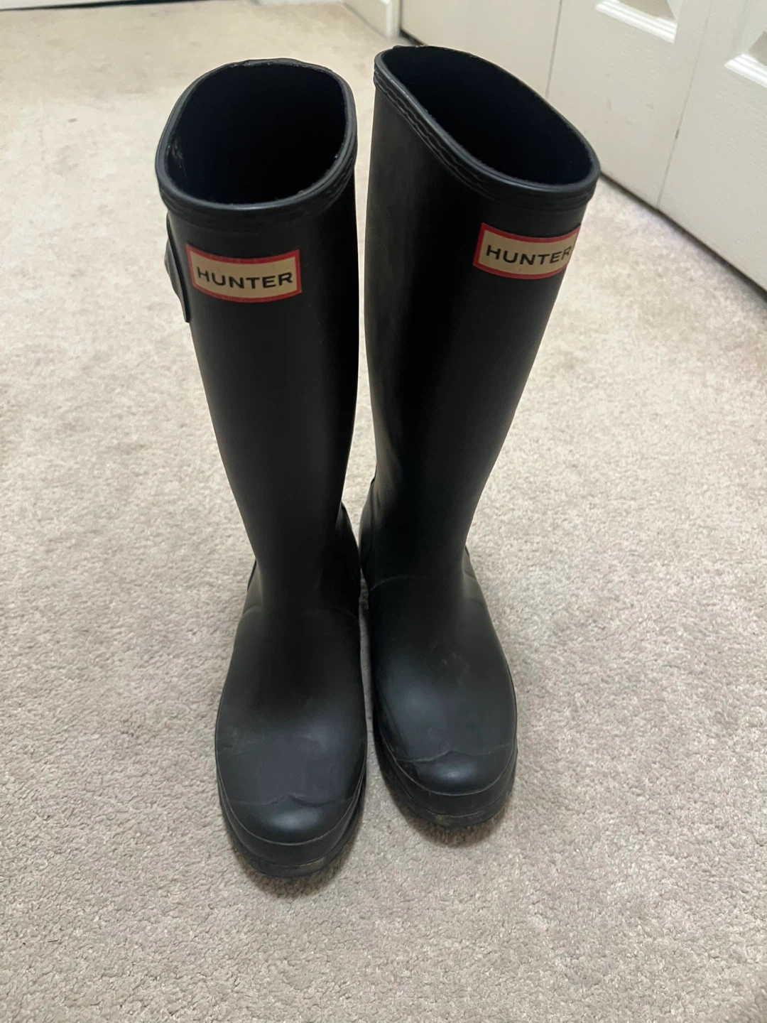 Selling a pair of Hunter Original Tall Rain Boots in black. They're in good condition and ready to keep your feet dry during those rainy days! Size US 6
