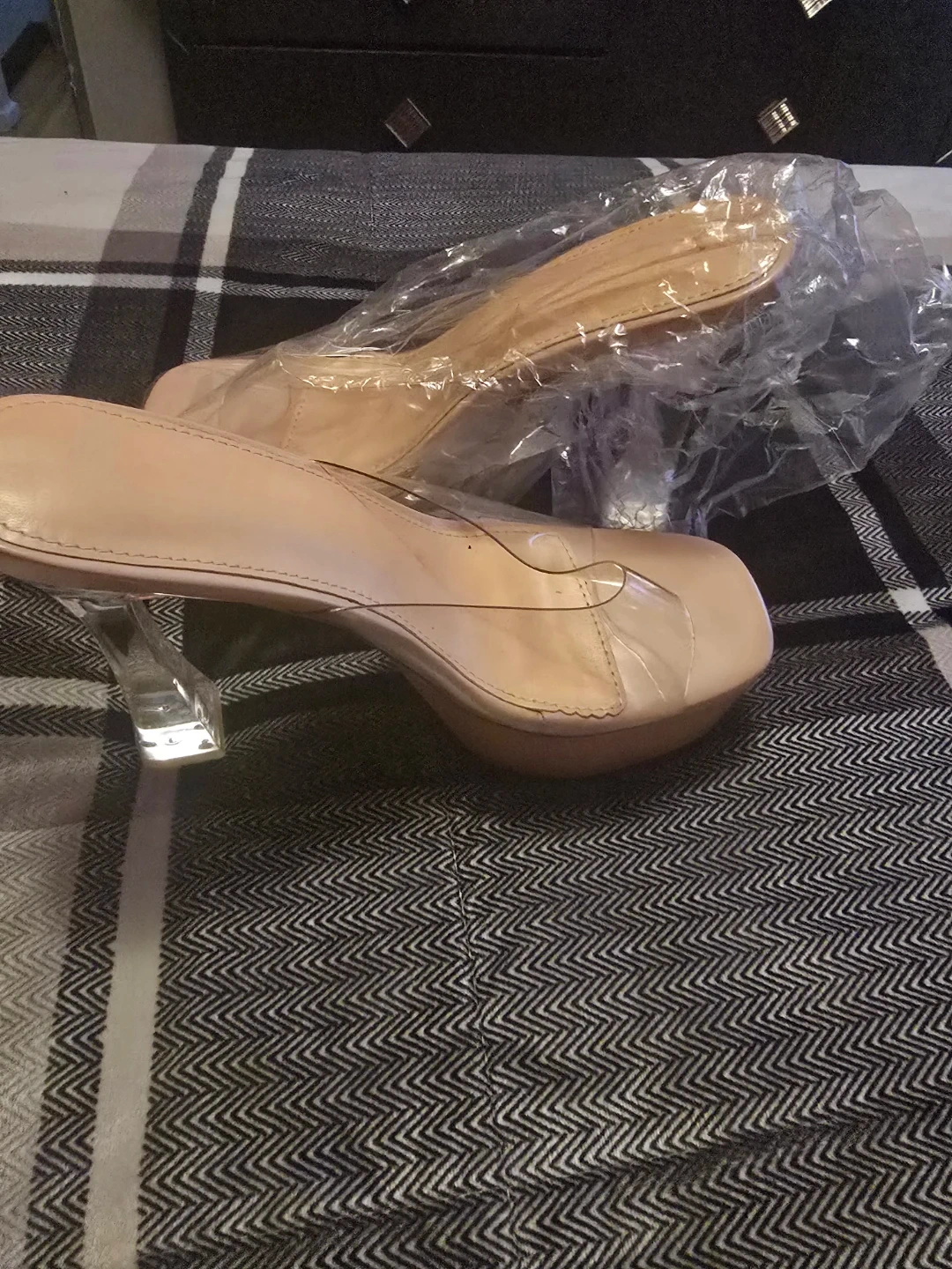 These stylish nude platform heels feature clear transparent straps for a modern look. They have a thick, clear block heel and a comfortable cushioned sole. Perfect for dressing up an outfit!