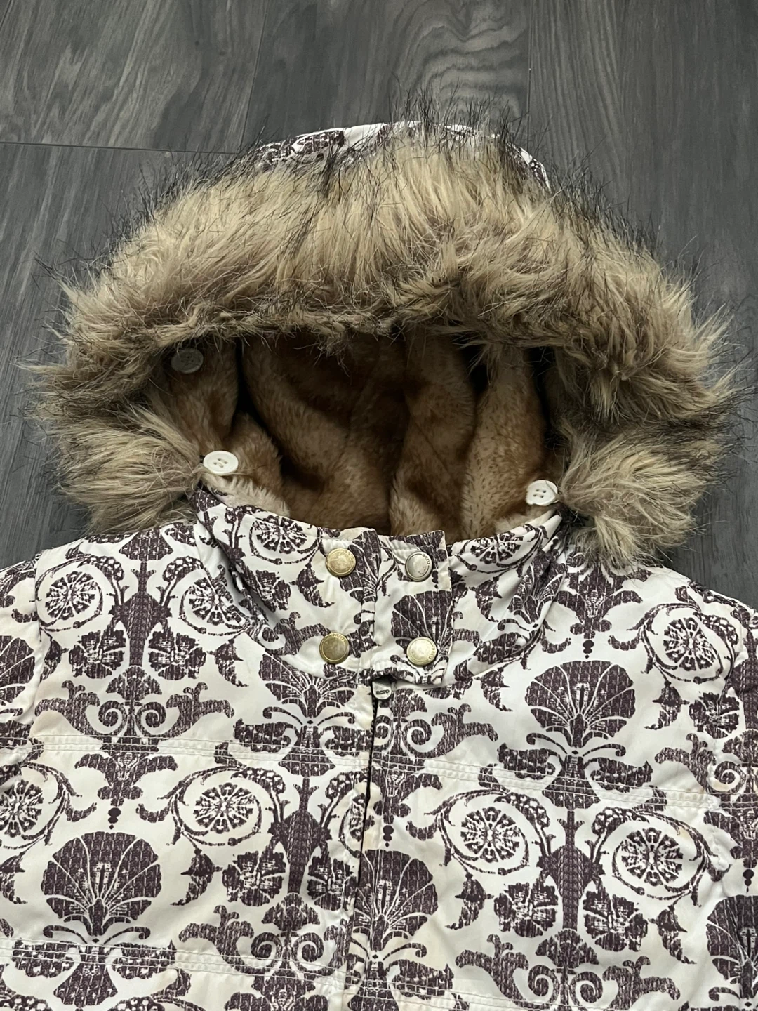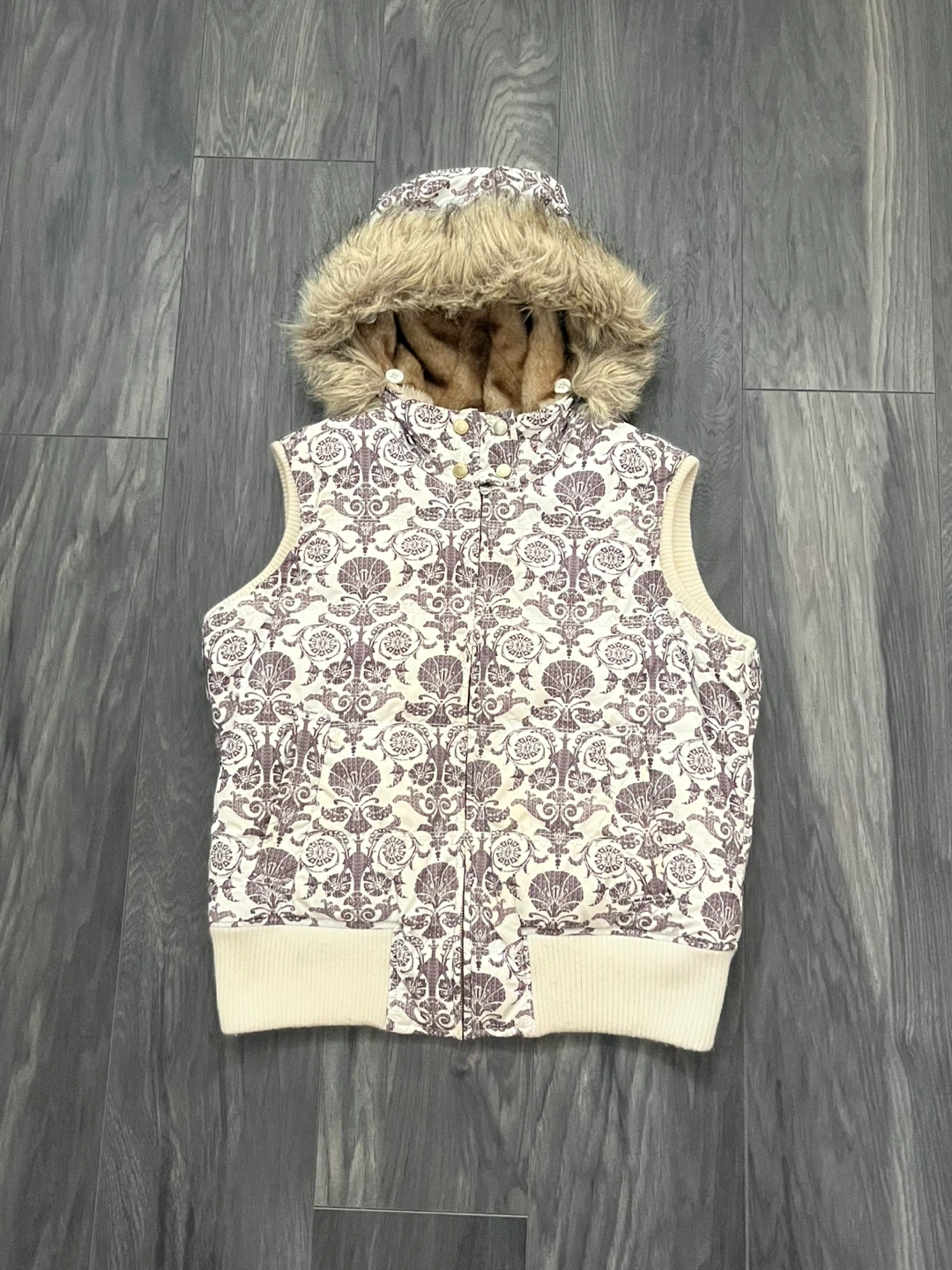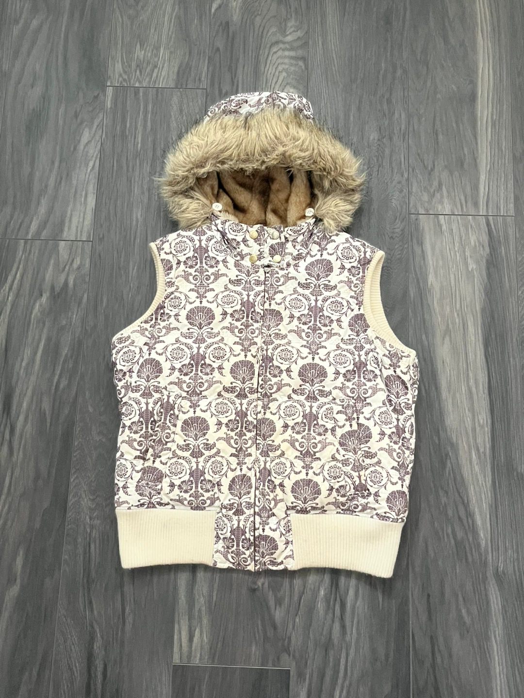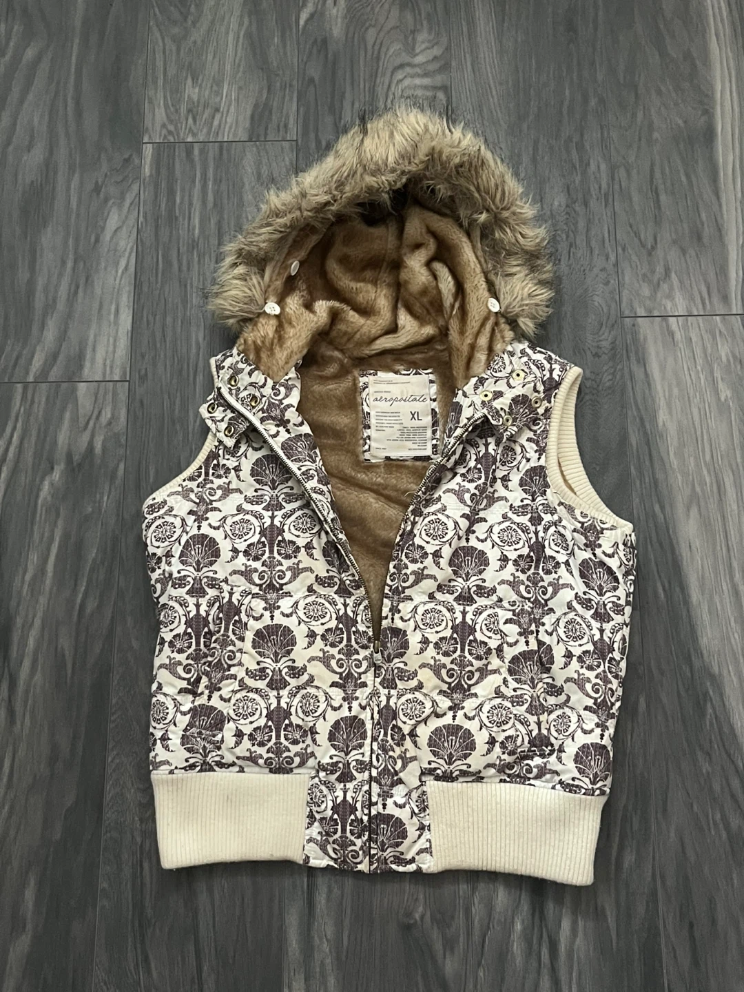 Y2K Aeropostale vest with faux fur hood and interior faux fur lining. Features cream coloured exterior with a dark brown ornate, baroque/floral pattern. Attached/removeable hood. Full zipper closure. Ribbed knit hem at the bottom to cinch at hips. Can be worn oversized. Y2k, one of a kind piece.