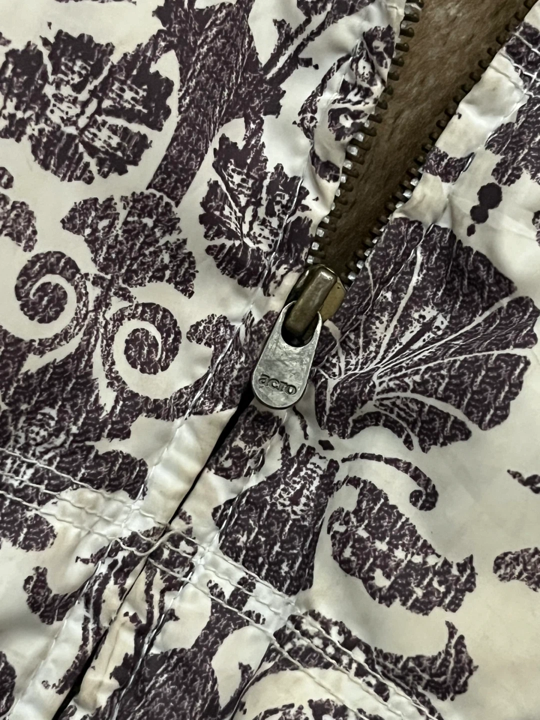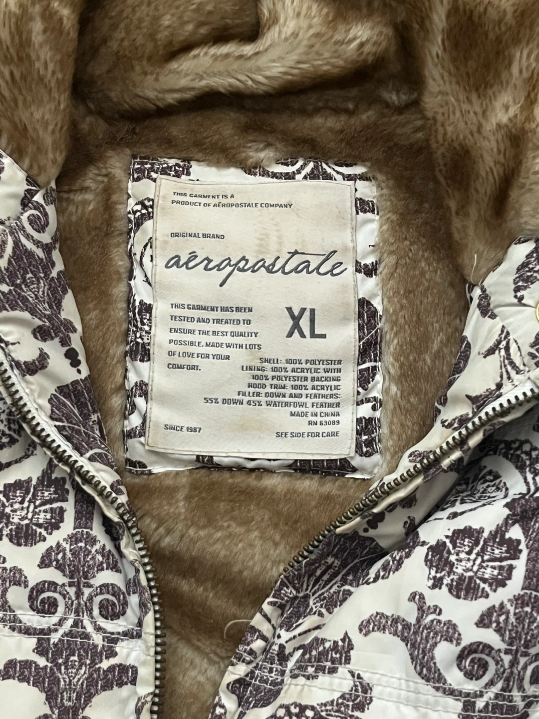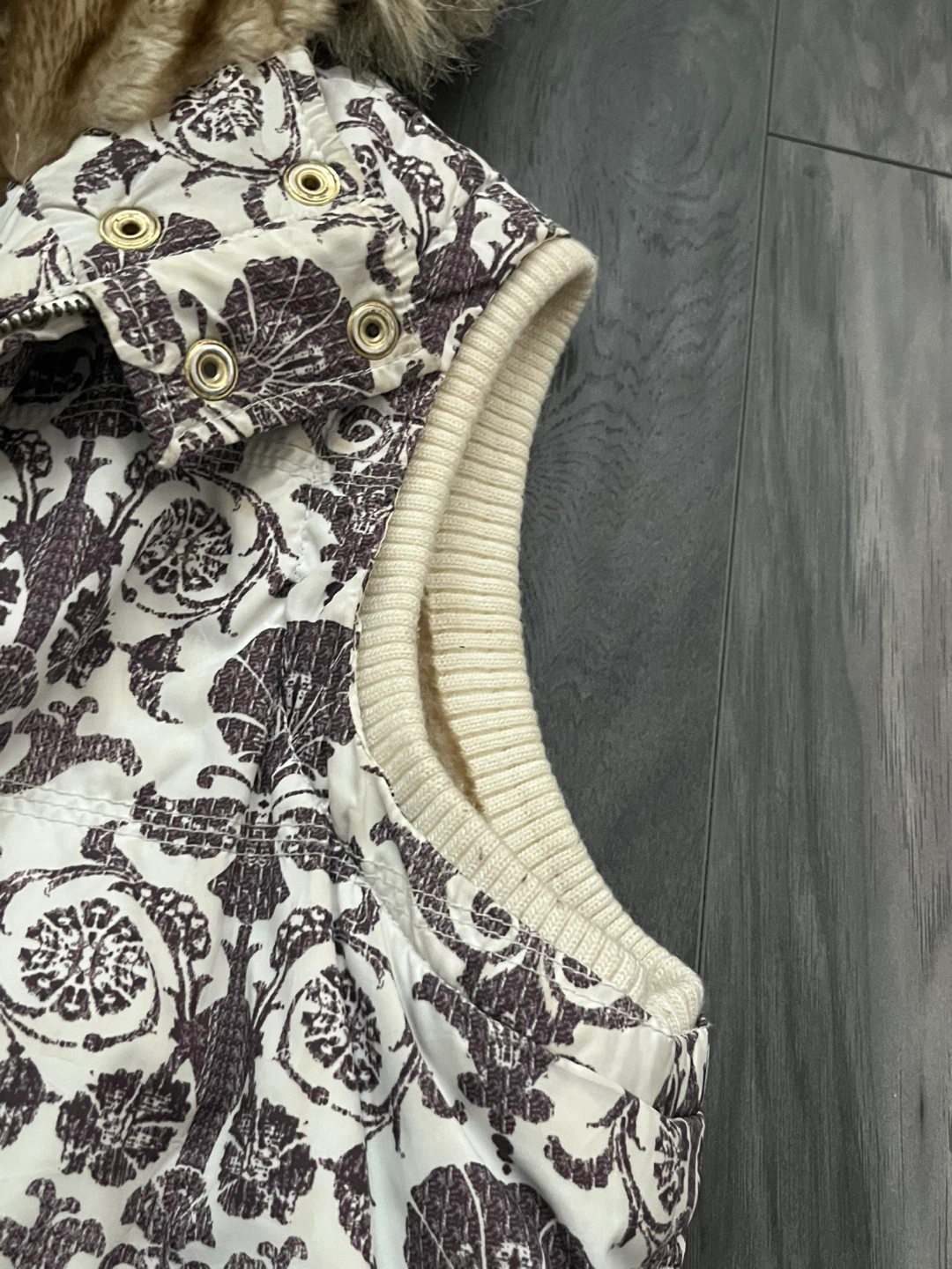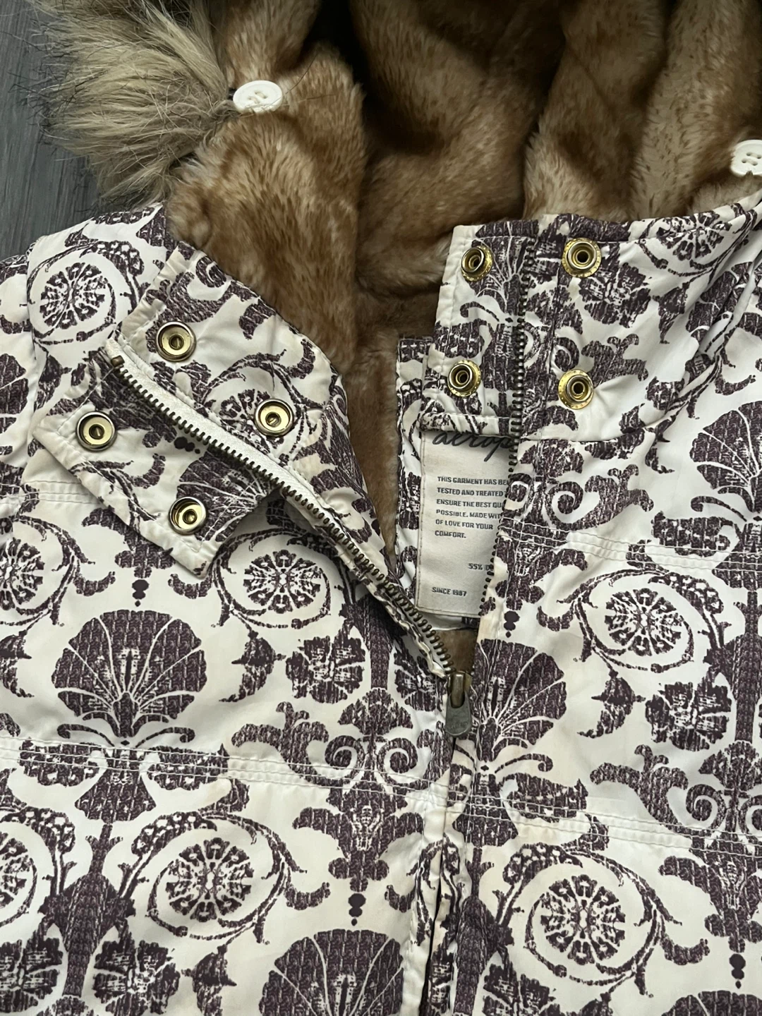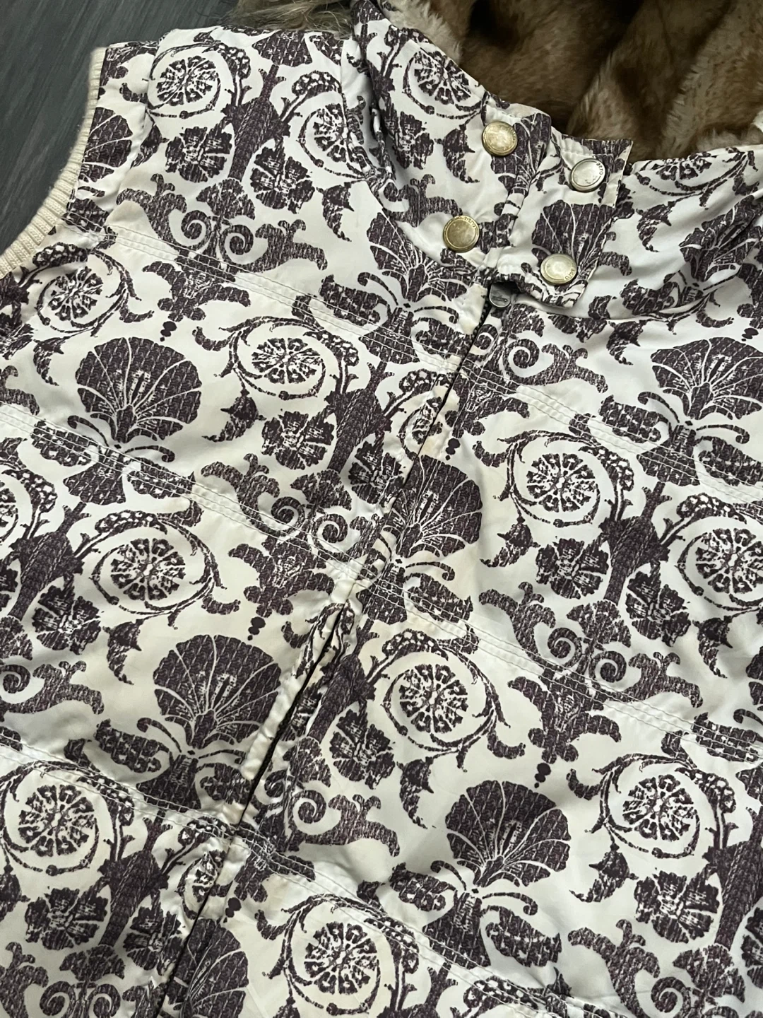 Y2K Aeropostale vest with faux fur hood and interior faux fur lining. Features cream coloured exterior with a dark brown ornate, baroque/floral pattern. Attached/removeable hood. Full zipper closure. Ribbed knit hem at the bottom to cinch at hips. Can be worn oversized. Y2k, one of a kind piece.