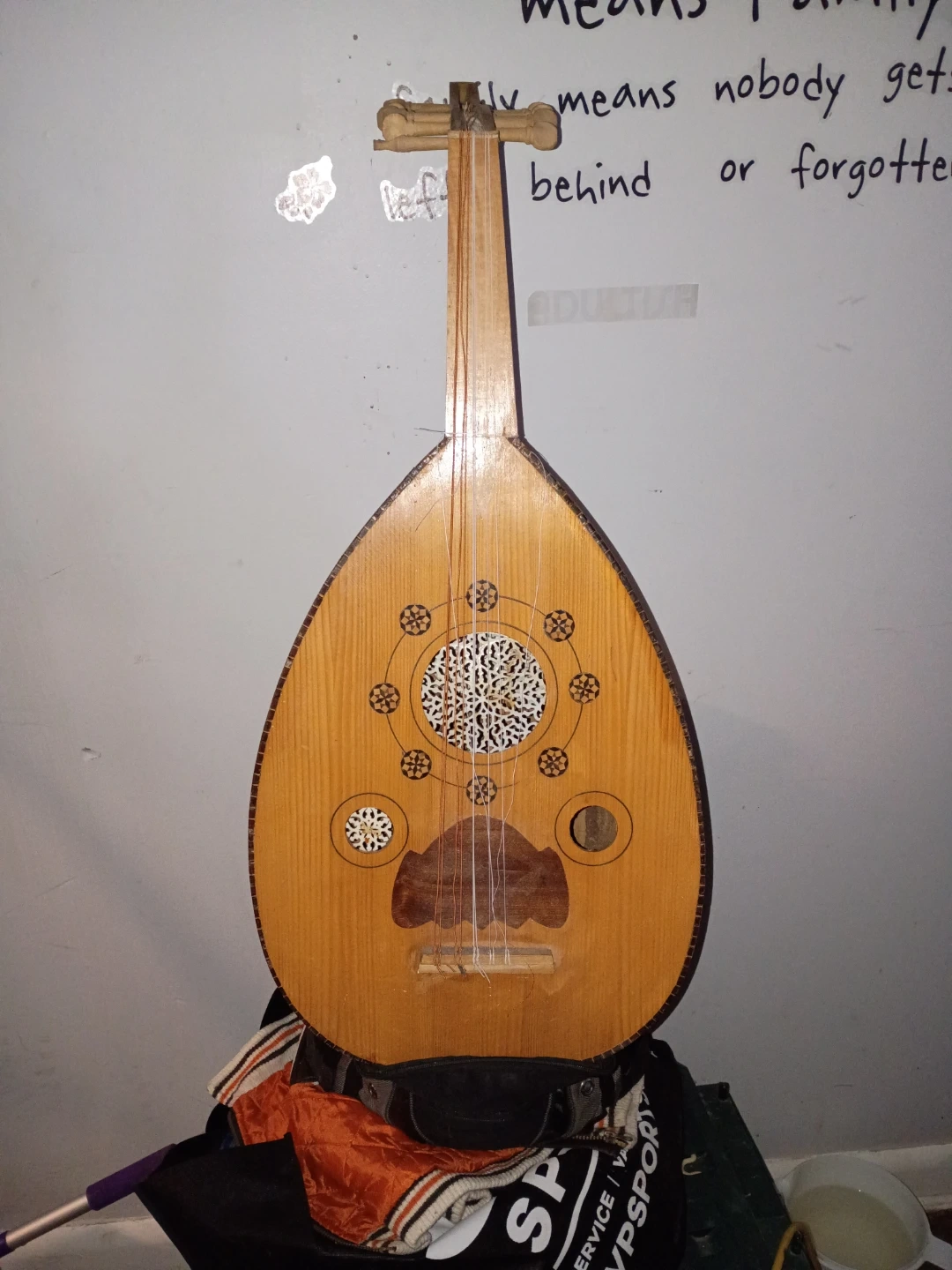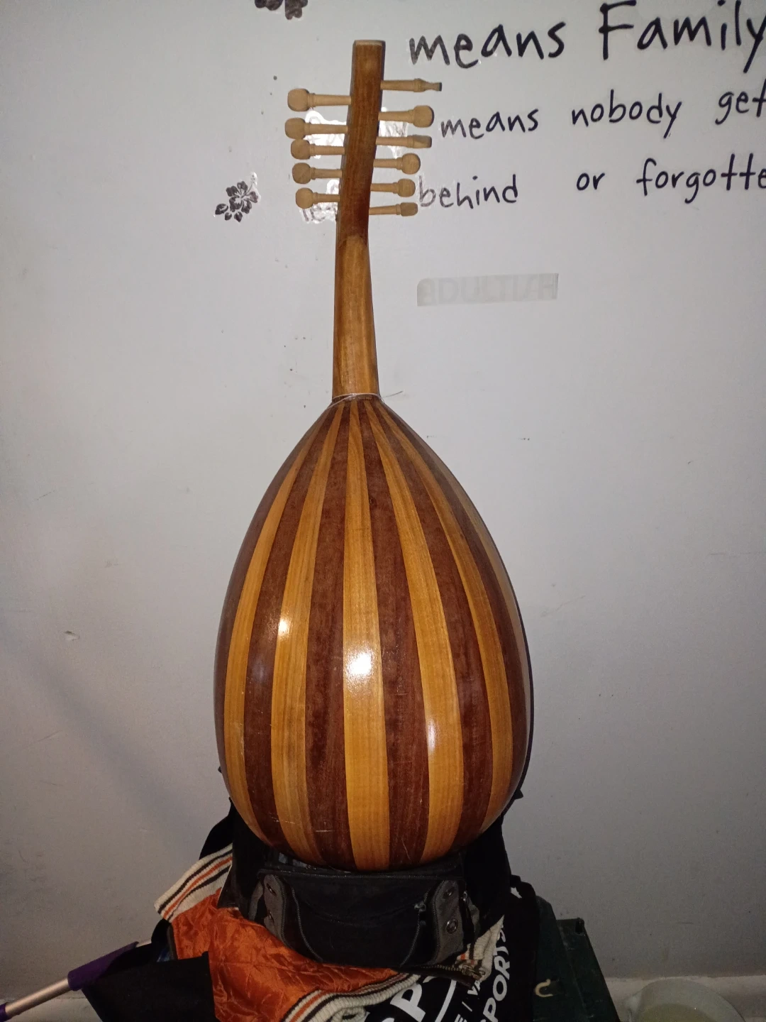 This is a wooden oud, a stringed instrument used in Middle Eastern music. It's crafted from light and dark wood for a striped effect on the body. The soundhole features decorative inlays. This instrument would be for musicians interested in traditional or world music.