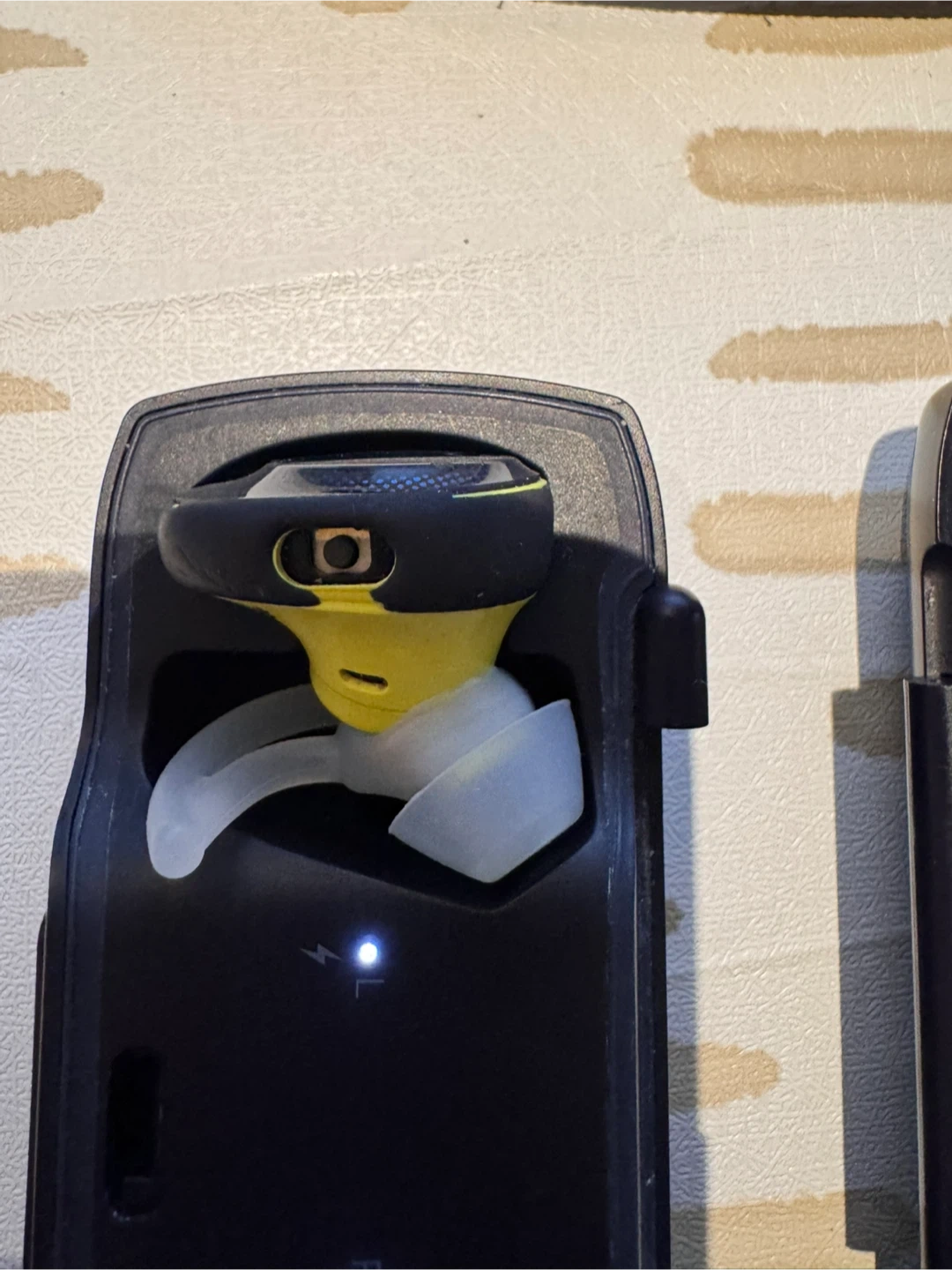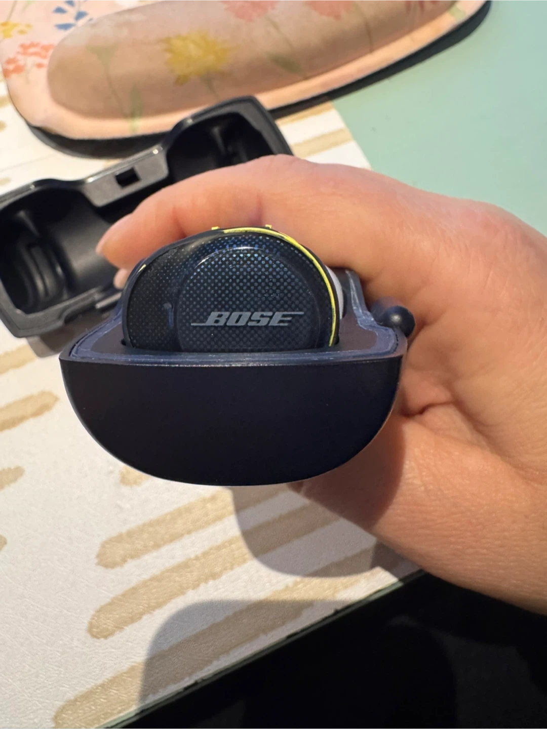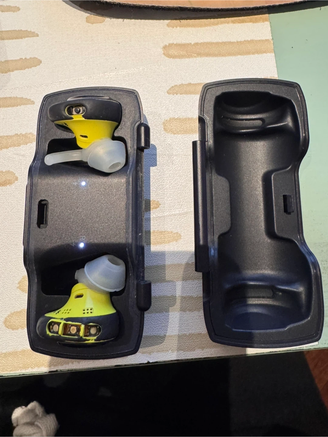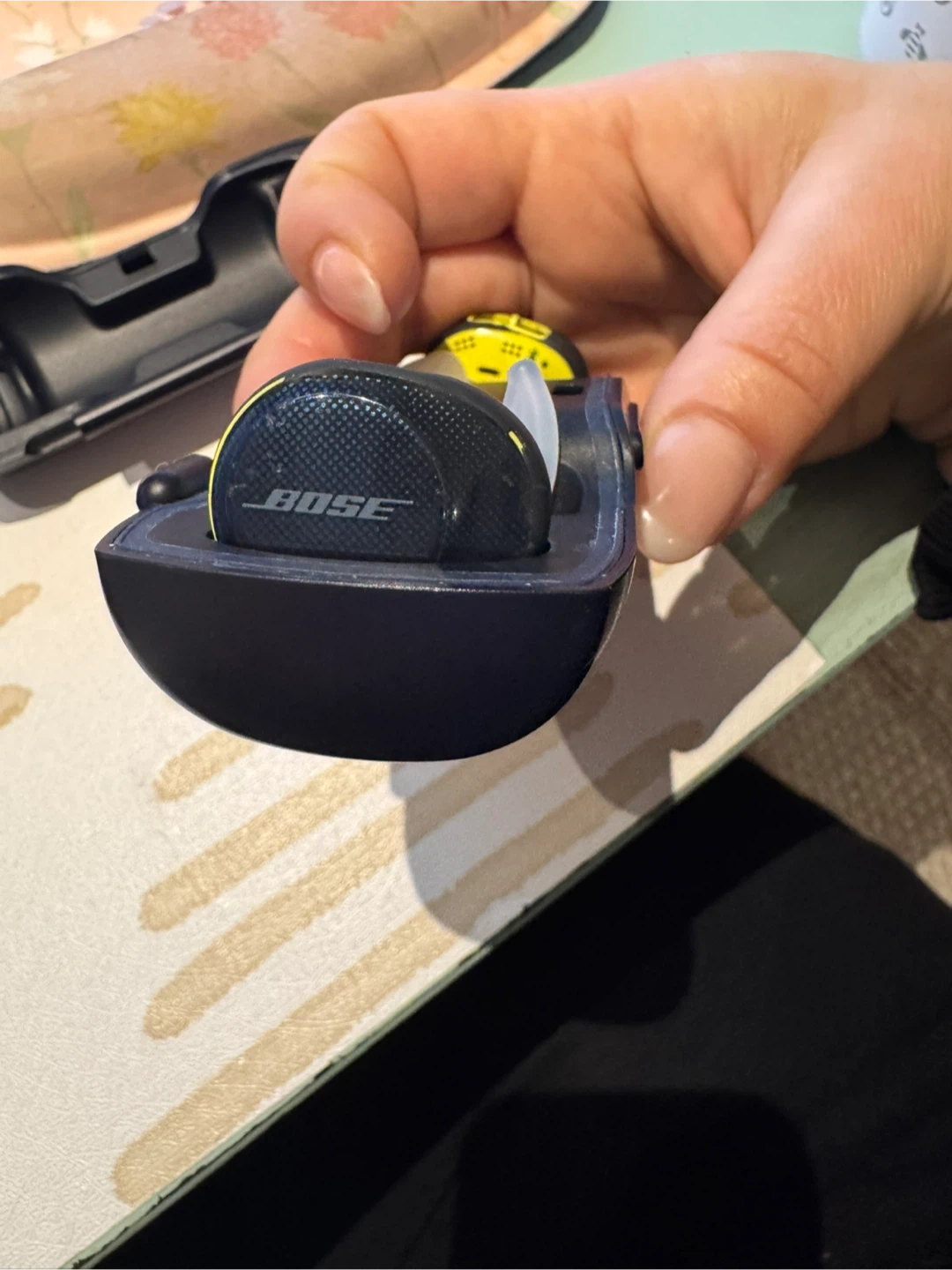 Yellow and black wireless earbuds by Bose. Includes charging case and ear tips.
