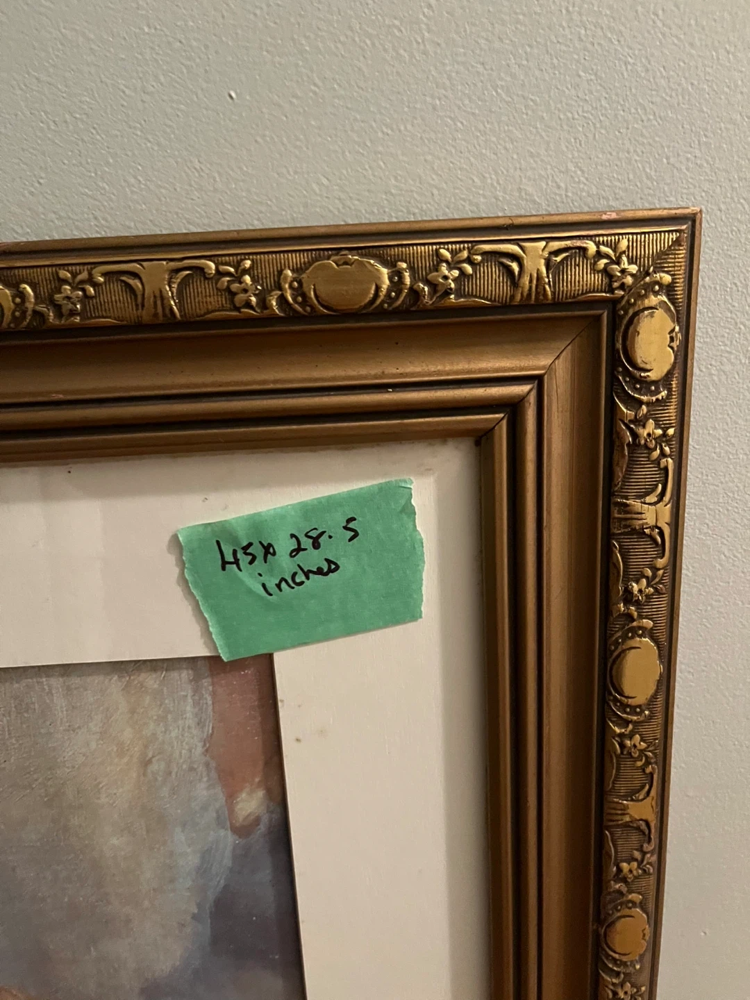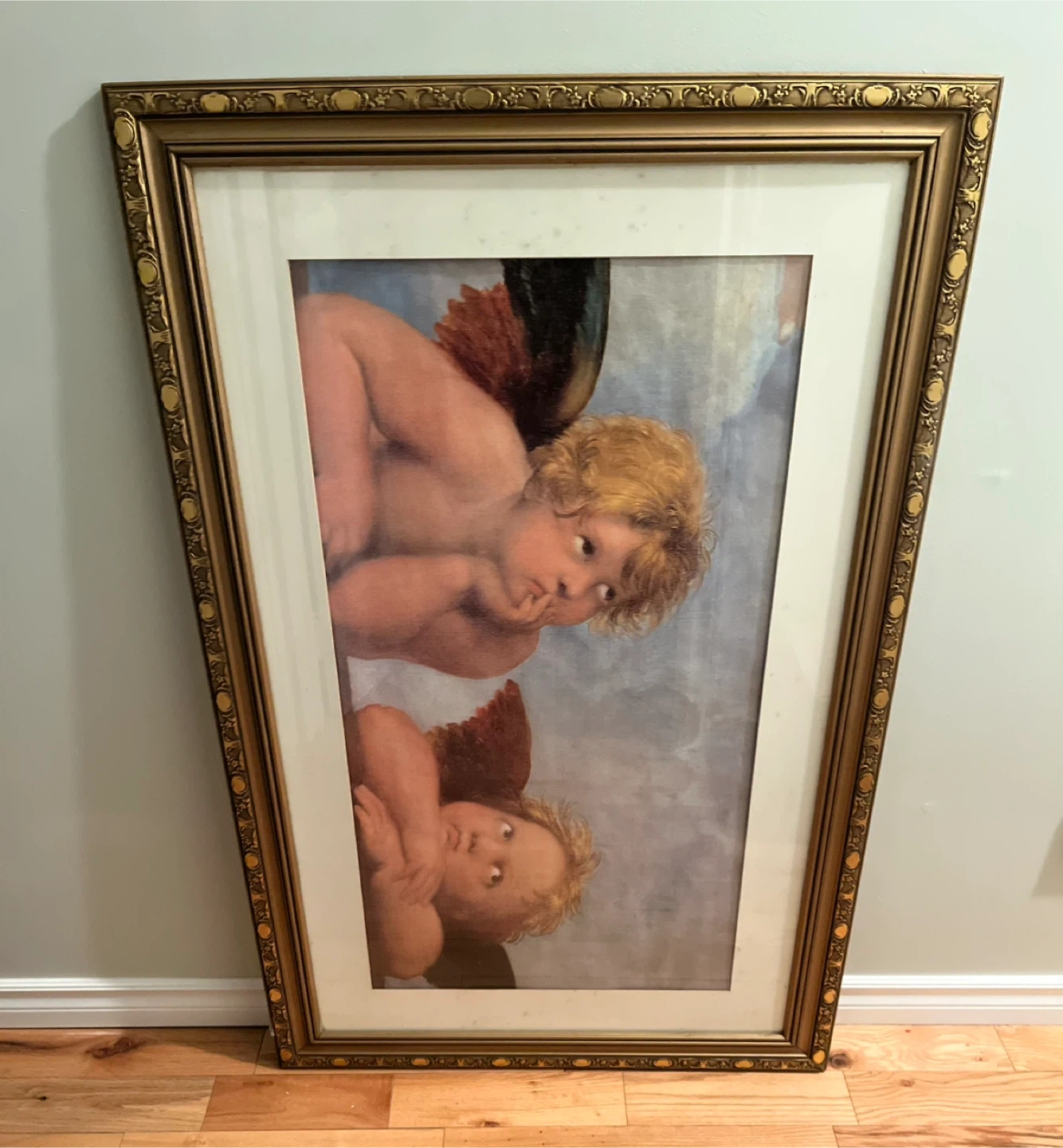 A lovely framed print featuring cherubs. The frame has an ornate gold finish. The print measures 45 inches by 28.5 inches, the frame it’s in great condition and the picture inside, the white layer has to be replaced