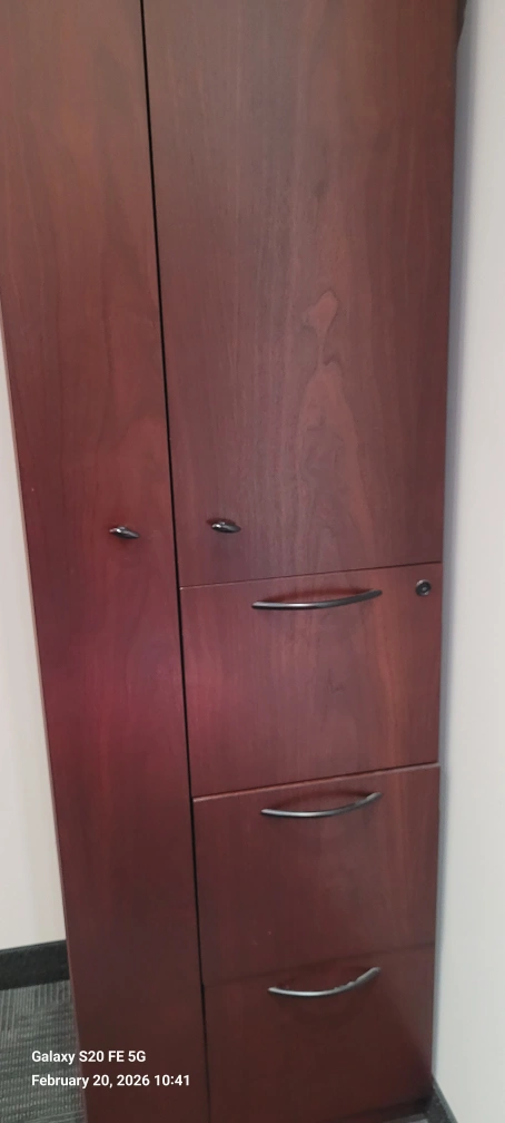 A grey three-drawer filing cabinet for your office needs. It has metal construction and a lock. Ideal for organizing important documents.