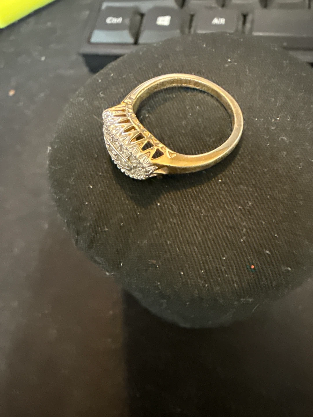 ring with diamond accents. It's a beautiful piece, perfect for any occasion. and the top features multiple small diamonds arranged in a decorative pattern. It's a classic design.