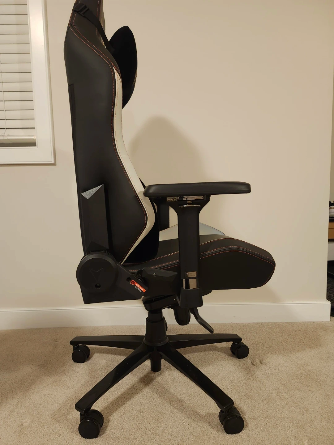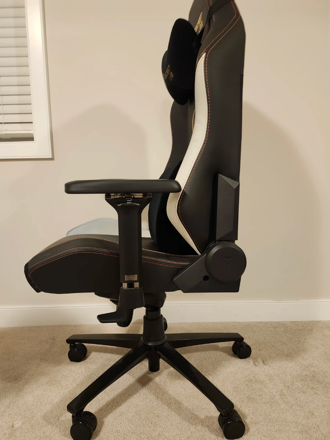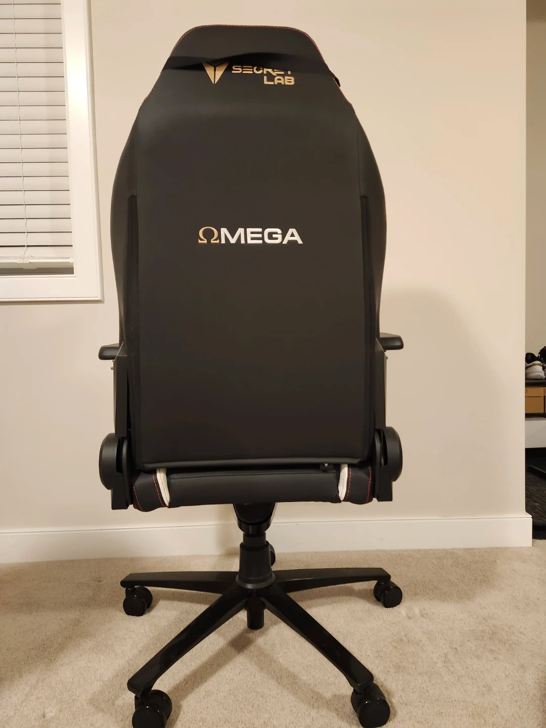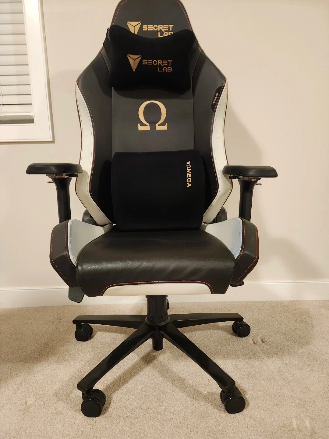 Secretlab Omega gaming chair in black with white and grey accents. It features adjustable armrests and lumbar support. This chair is designed for long gaming sessions.