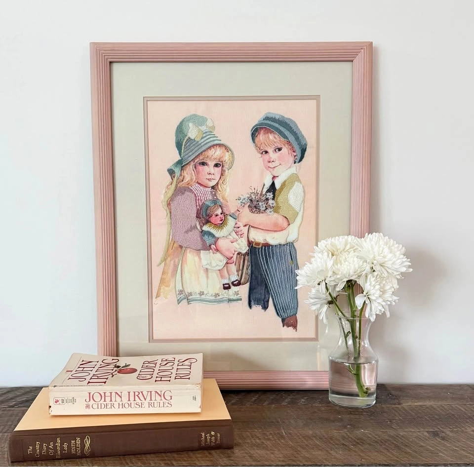 Vintage framed crewelwork in a soft blush pink frame. Perfect for a bedroom, nursery, or cottage-inspired space. "Spring and Lance" crewelwork kit by Needle Treasures Stitchery adapted from original watercolour by Jan Hagara (1977). Condition: Excellent. Dimensions: 15.75 x 19.75 inches. Pickup in Keswick or Newmarket.