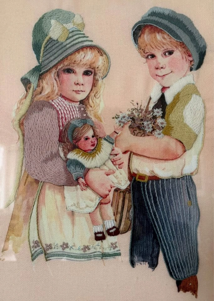 Vintage Framed Crewelwork Art in Soft Pink Frame