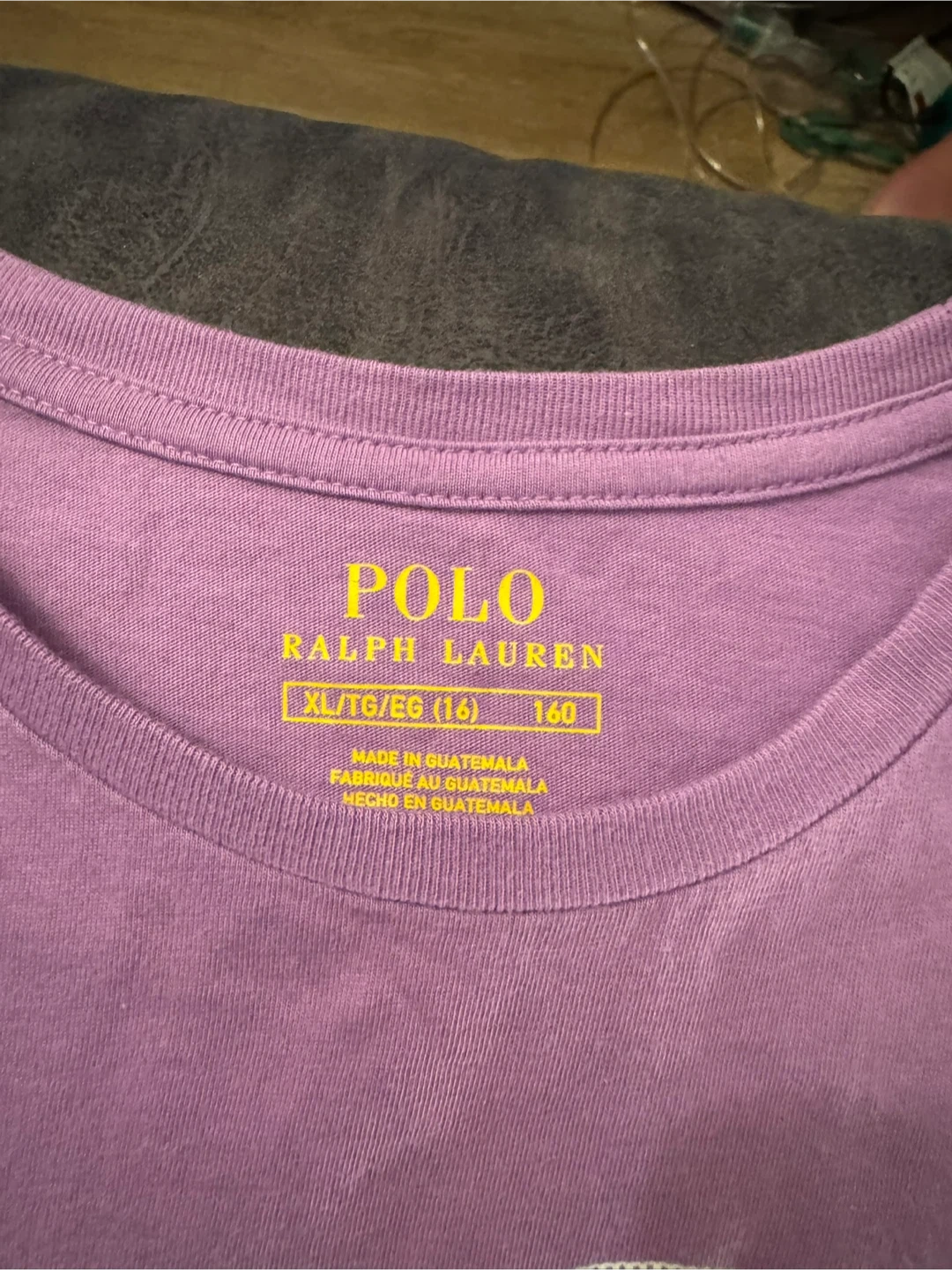 This is a purple Polo Ralph Lauren t-shirt with a white heart and 'Polo' graphic. It's a size XL/TG/EC (16) and made in Guatemala. A comfortable tee for everyday wear!