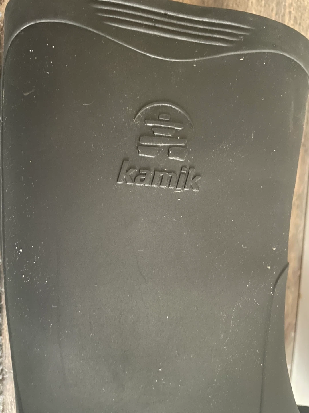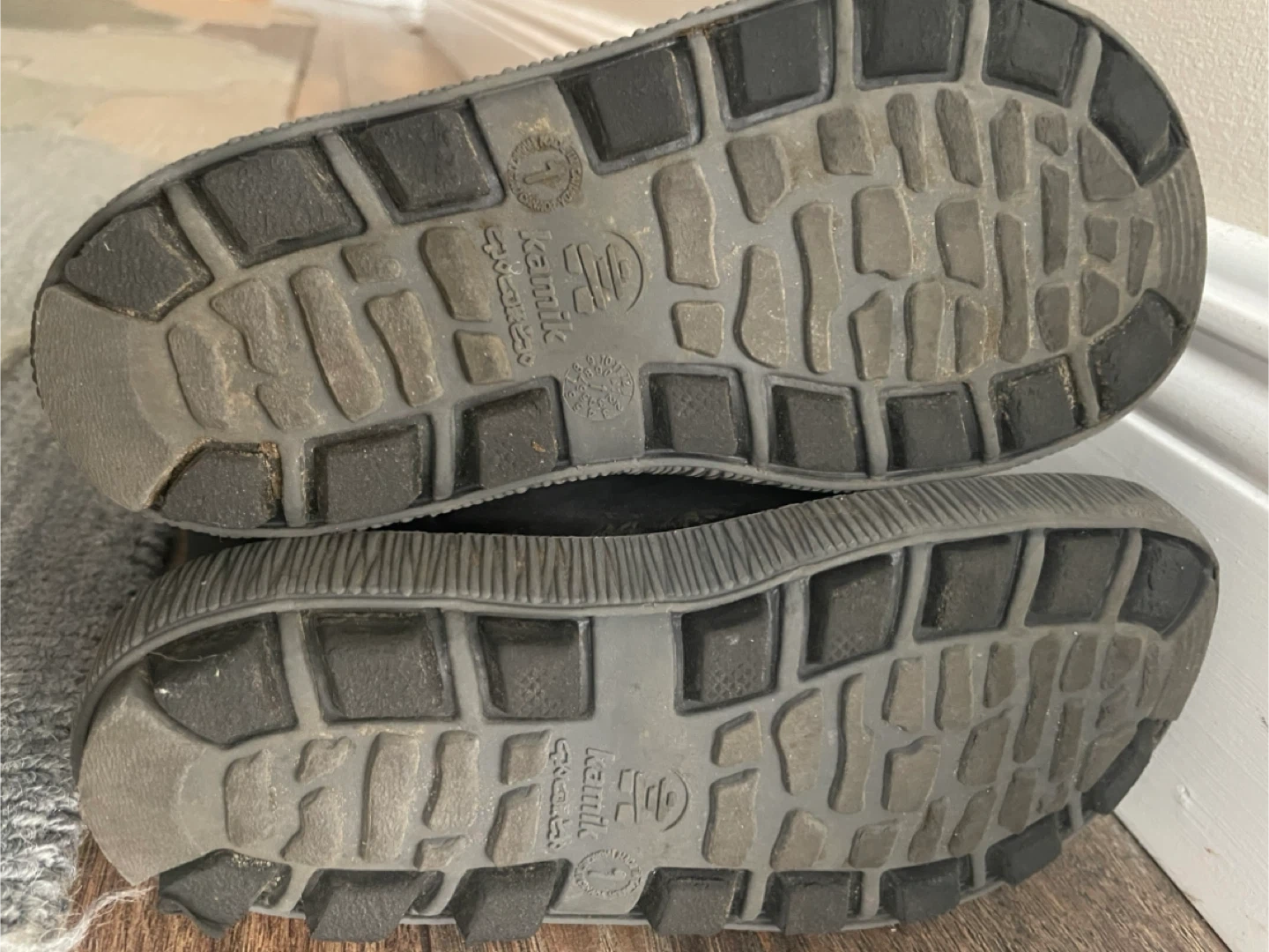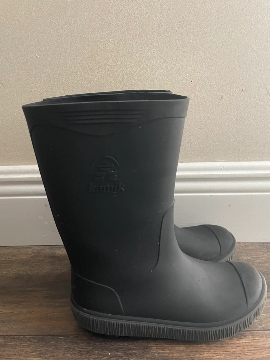 Kamik black rubber rain boots. Kids Size 1. Waterproof material. These boots are great for rainy or muddy days!