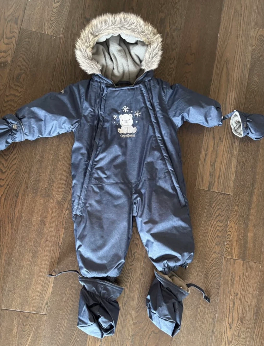 OshKosh B'gosh snowsuit for kids. It's blue with a cute teddy bear and snowflakes graphic on the chest. Features a cozy faux-fur lined hood and includes attached mittens and foot coverings. This snowsuit is perfect for keeping little ones warm during cold weather play!