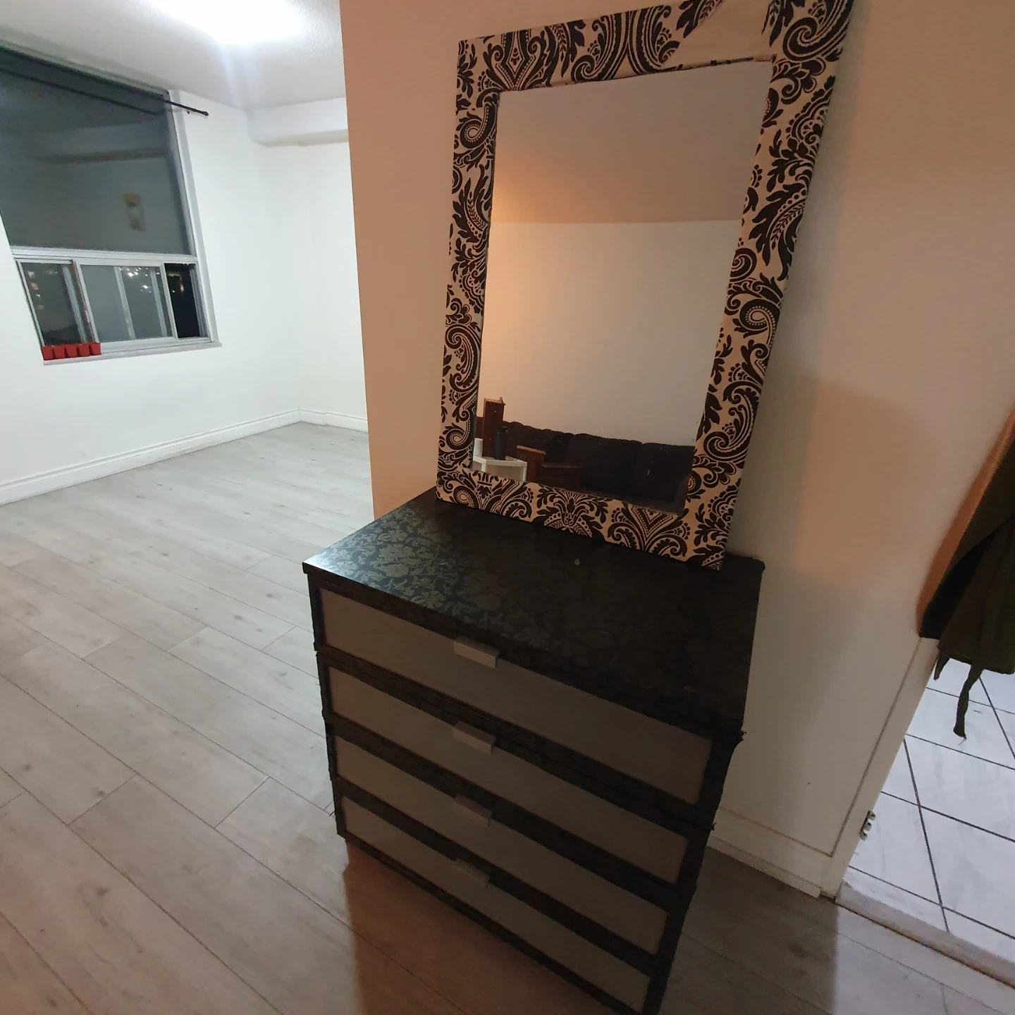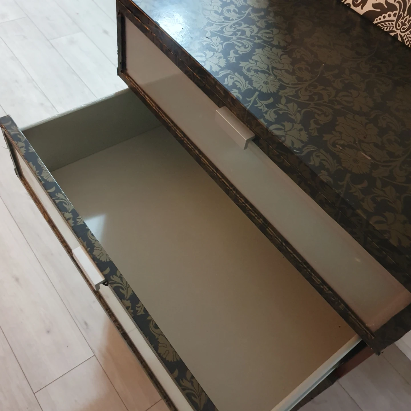 This dresser features a decorative patterned top and frame, with four drawers for storage. It comes with a matching mirror that has a patterned surround. Perfect for a bedroom or entryway! The patterns are just wrapped so if you don't like it you can remove it as well.