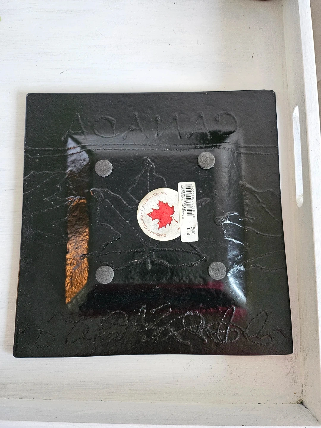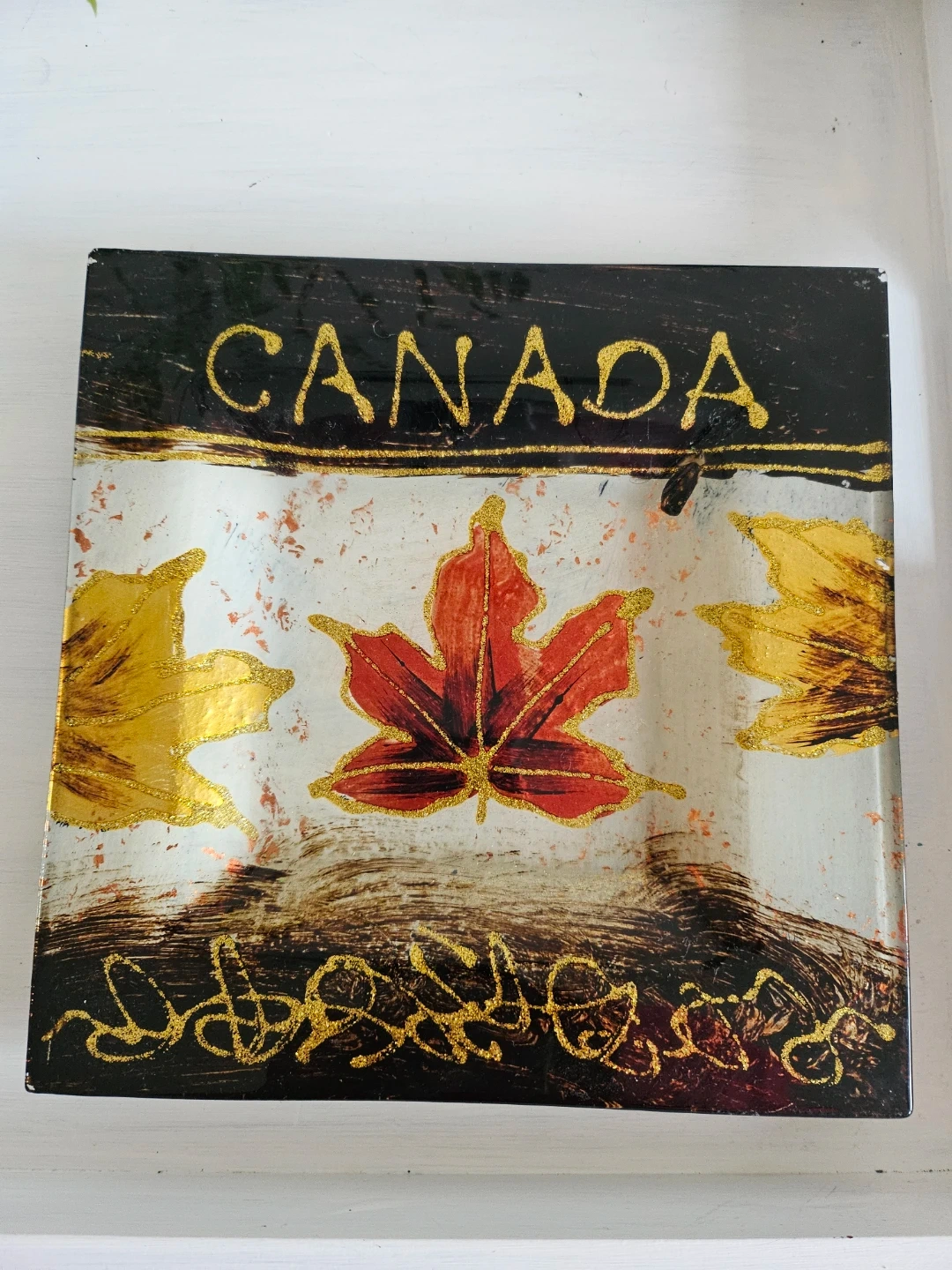 A decorative glass square plate featuring a vibrant red maple leaf and gold accents, with 'Canada' text. It's designed and made in Canada, perfect for display. Features rubber feet on the bottom for stability.