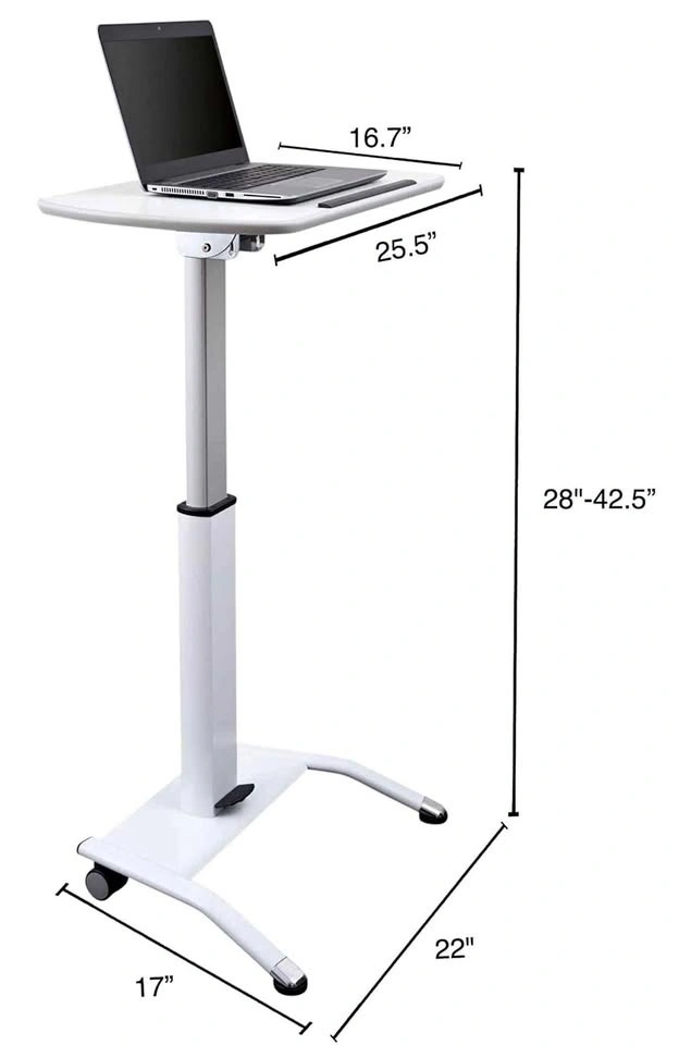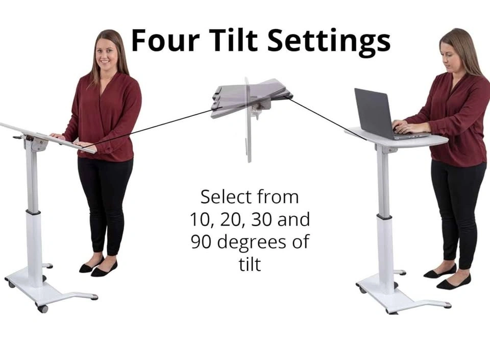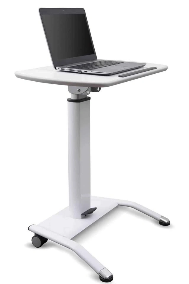 Pneumatic height-adjustable stand-up desk / lectern with tilting surface. Great for working from home, presentations, teaching, Zoom calls, or as a compact standing desk. Clean white finish.