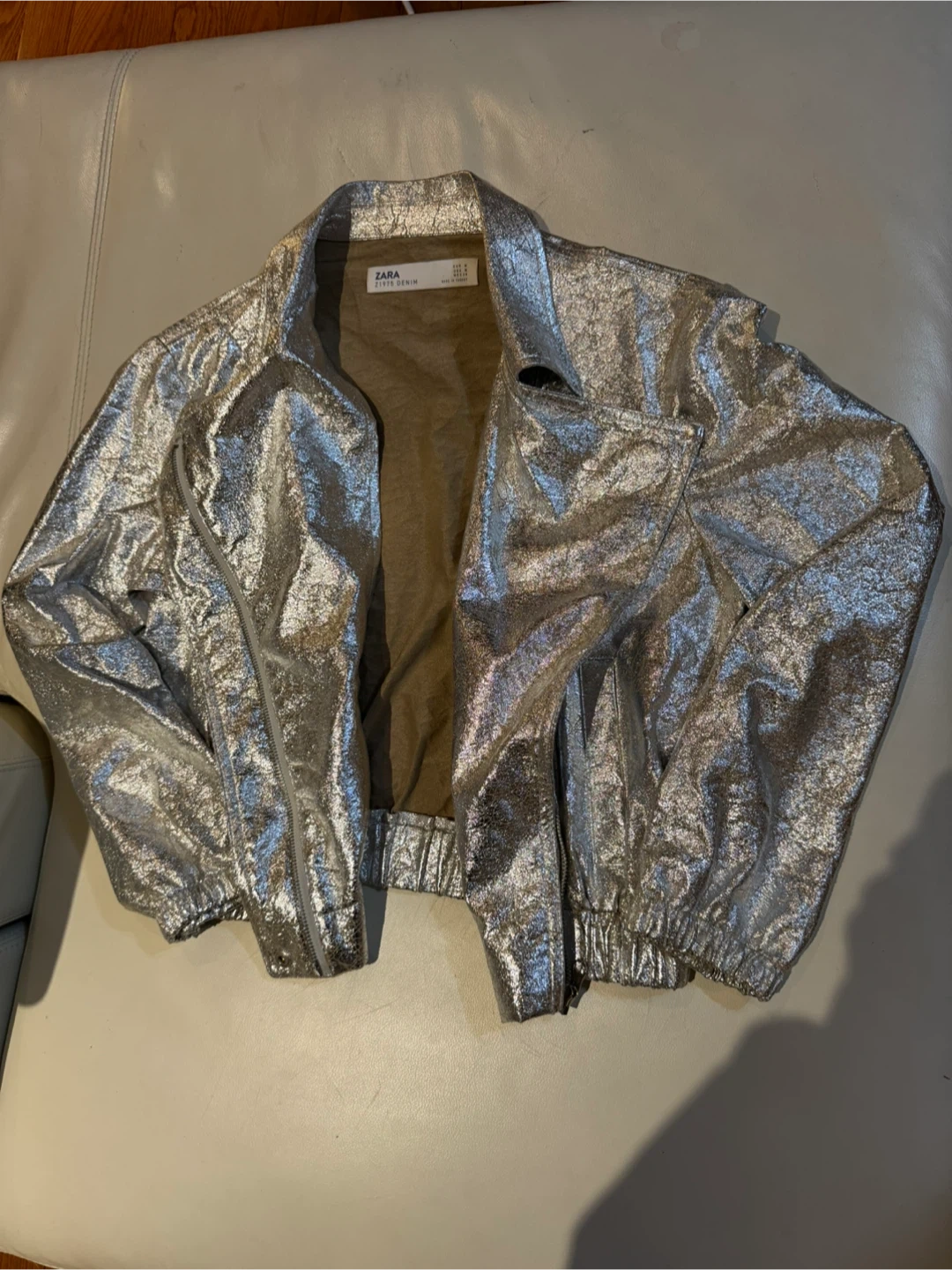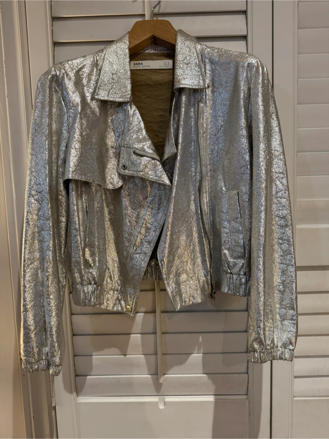 Selling a Zara jacket in a shiny silver colour! It's a size M and in great condition. Perfect for adding a bit of sparkle to your outfit!
