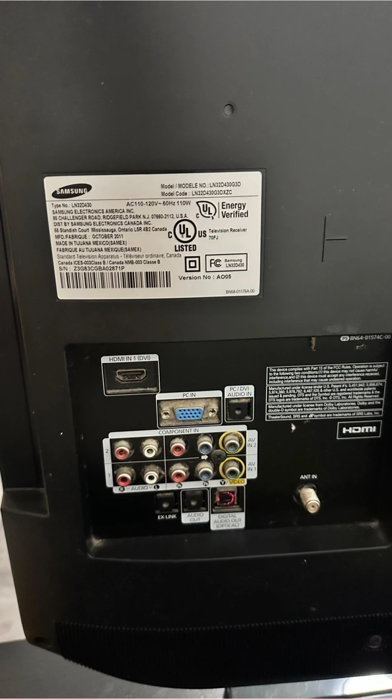 Samsung 32 inch flat screen television. This TV has HDMI, PC/DVI audio in, component in, and AV inputs. It's a great size for a bedroom or a smaller living room:
