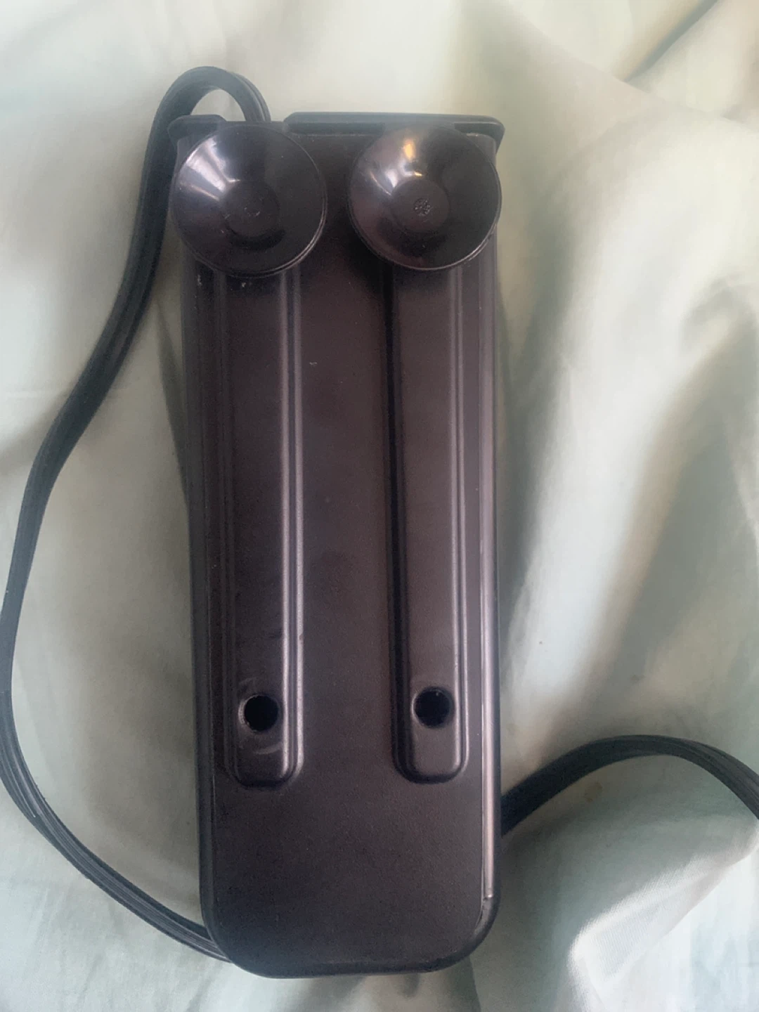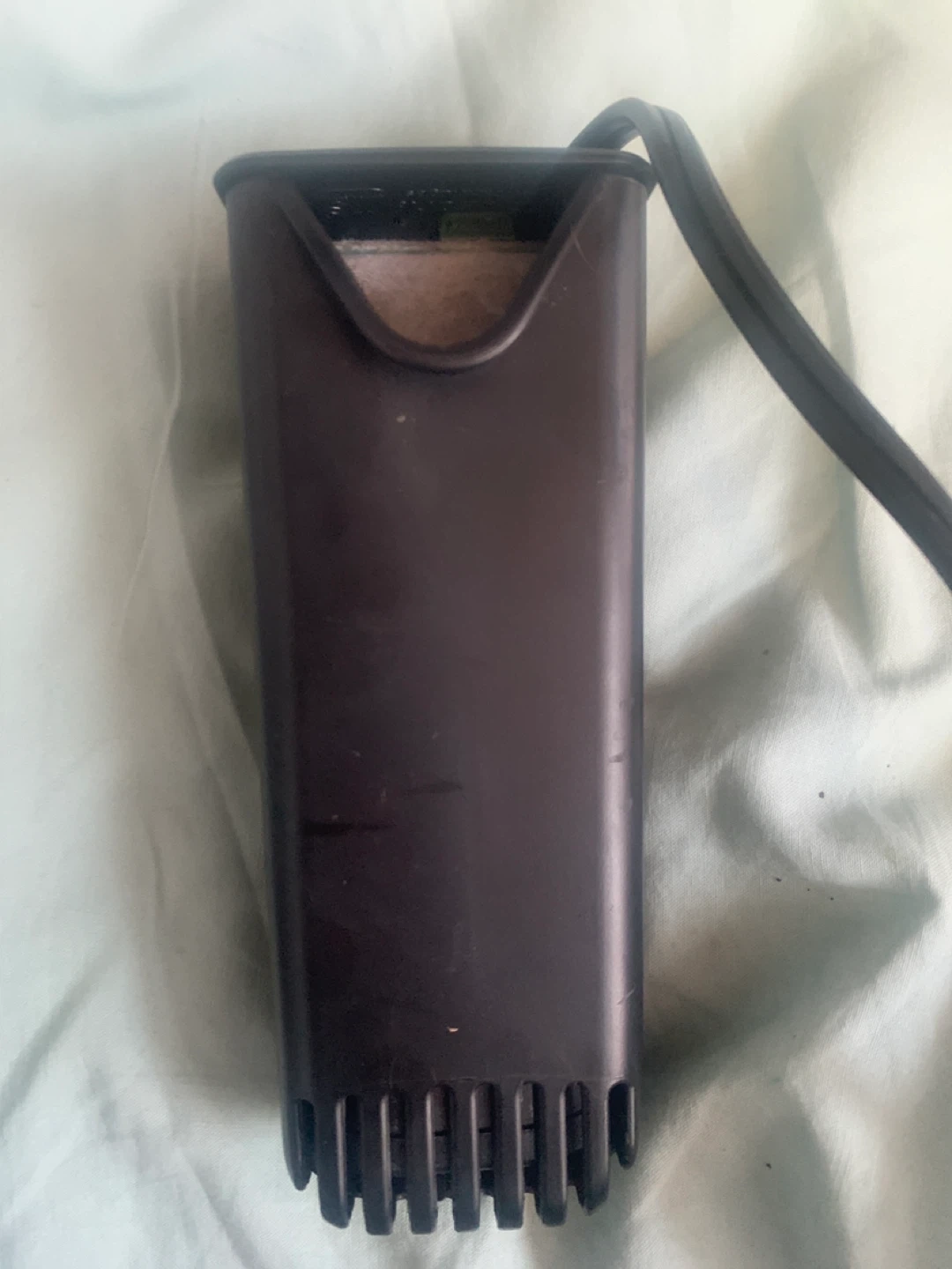 This is an aquarium filter and heater combo unit. It has a dark brown casing and includes suction cups for mounting. The filter intake is at the bottom and the output is at the top. It's designed to maintain water quality and temperature for fish tanks.If you want me to I could make the price lower just ask it could be more affordable for your bucket!!