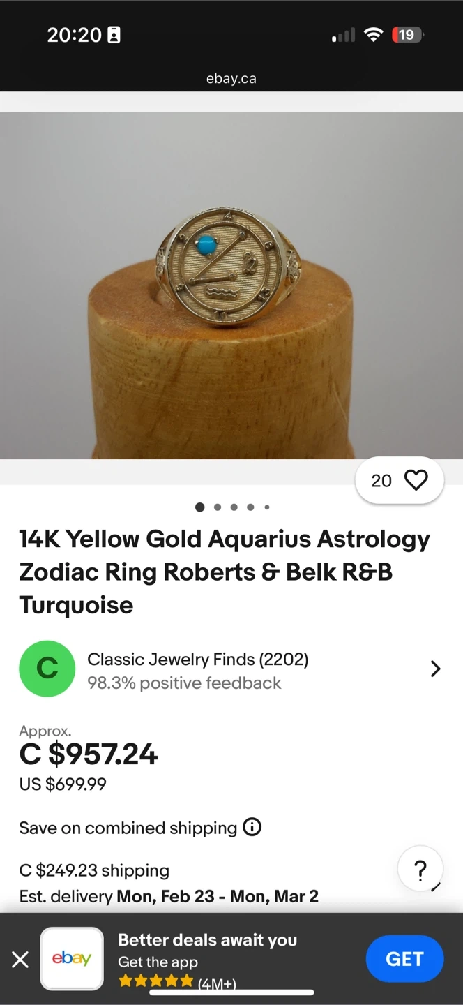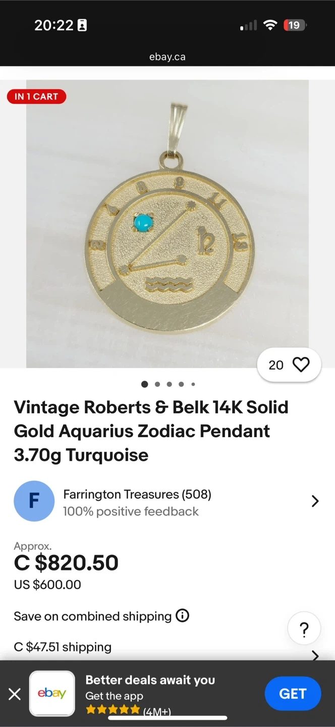 A vintage 14K gold pendant featuring the Aquarius zodiac sign. It's set with a brilliant turquoise stone. This piece is marked 14K and made in Canada. It's a great find for astrology enthusiasts and the perfect gift! Just under 2.5g.