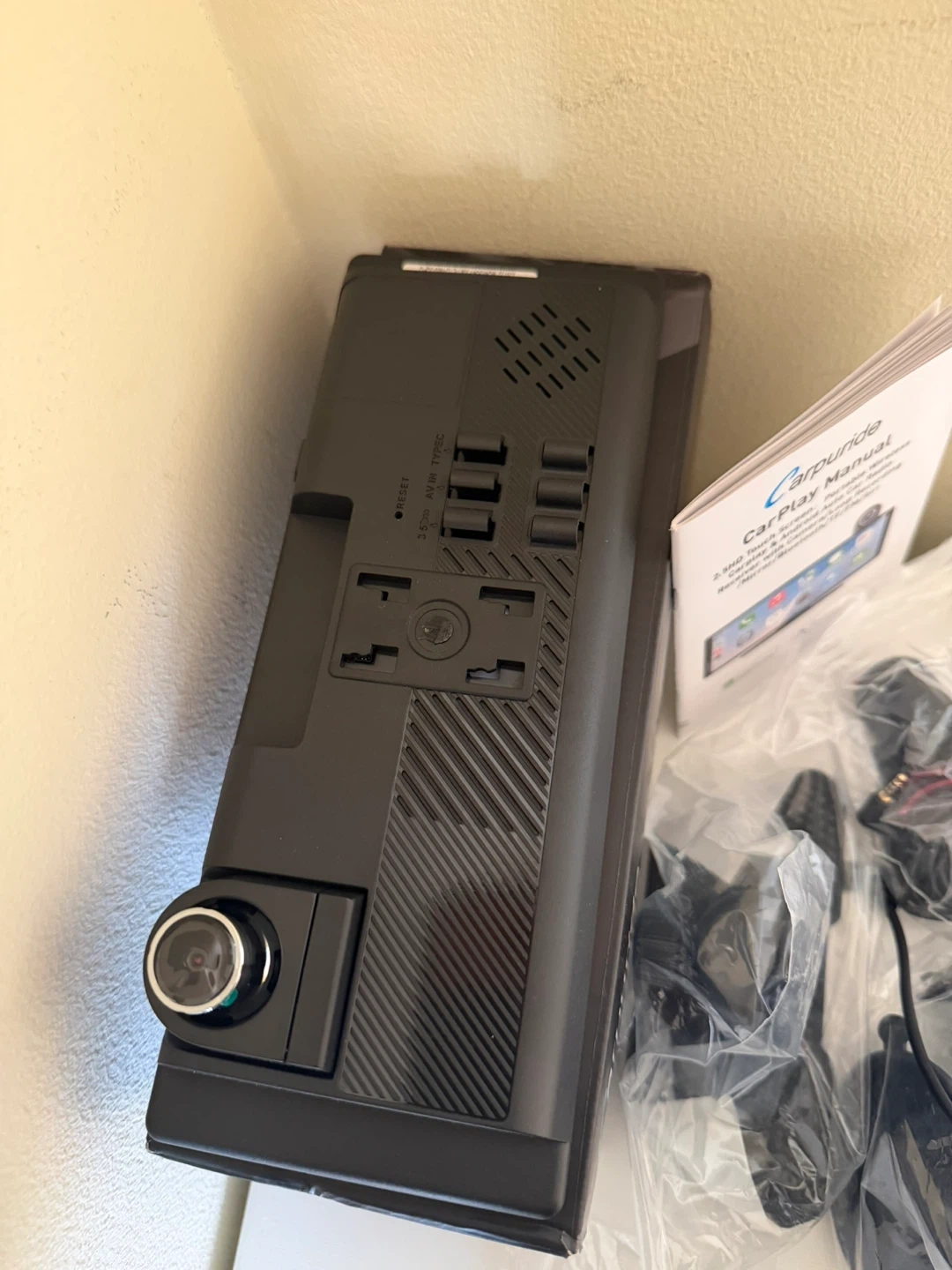 Carpuride 10.2" portable wireless CarPlay system with a HD IPS touch screen. It supports Bluetooth, AUX, TF card, and audio video inputs, along with voice controls. Comes with all cables and the manual for setup. A dashcam is also integrated.