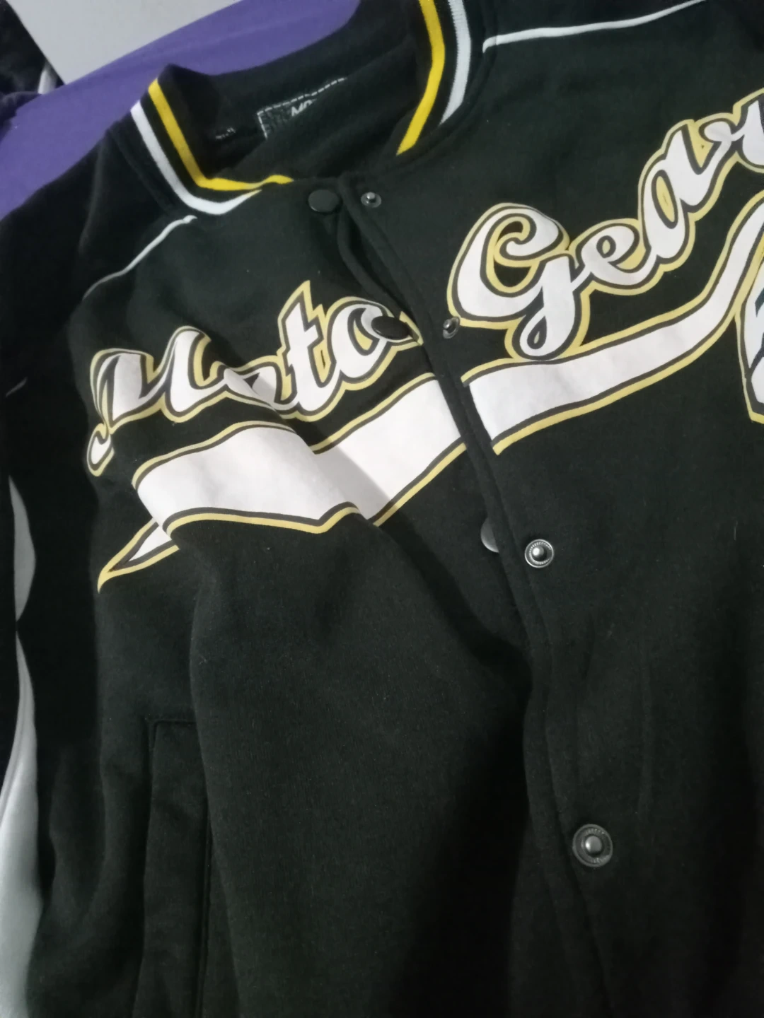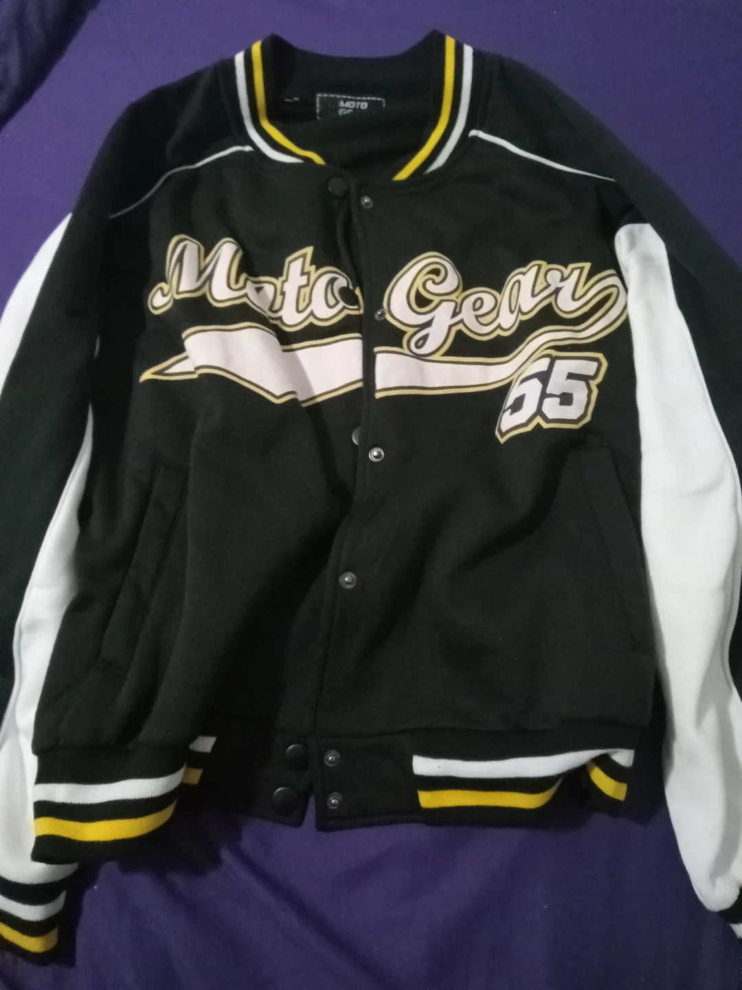 Trendy Black Moto Gear varsity jacket. It has snap button closures and striped cuffs and collar. Features "Moto Gear 55" graphic on the front. Men or women could wear it. Brand new never worn before