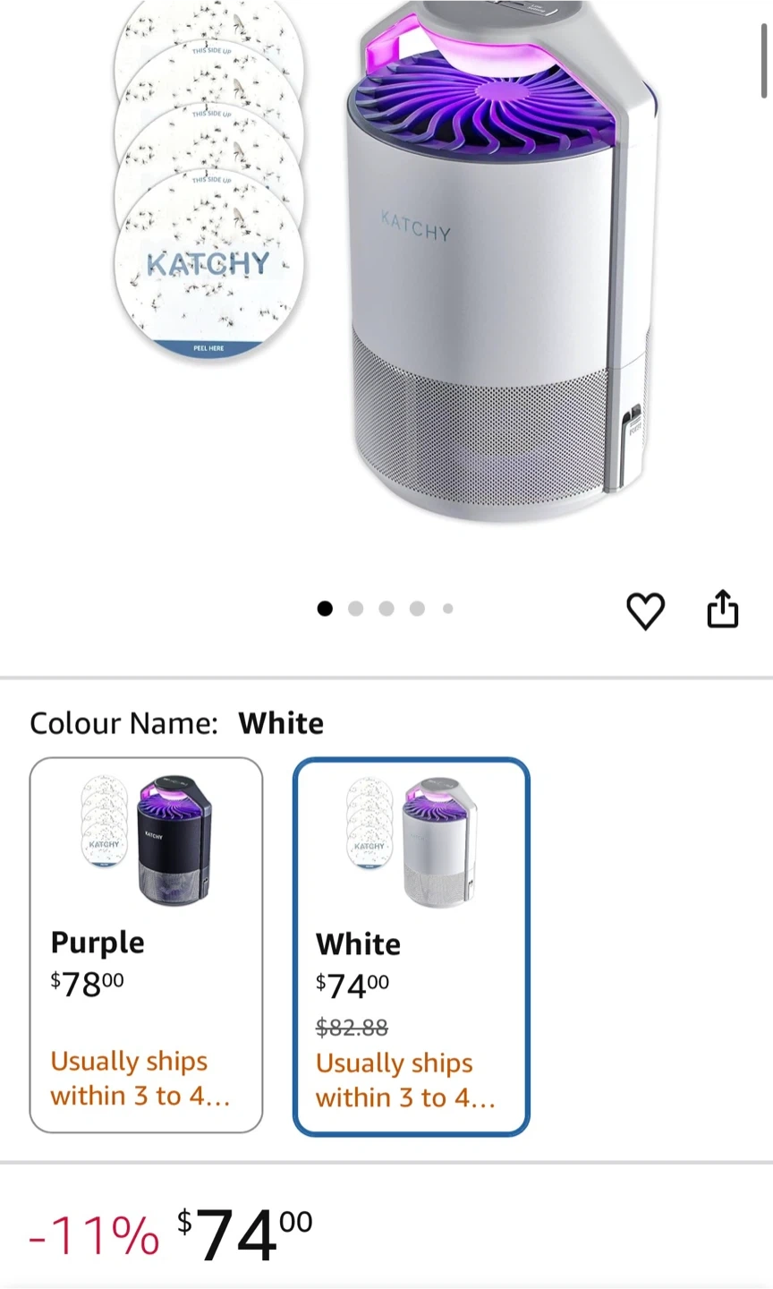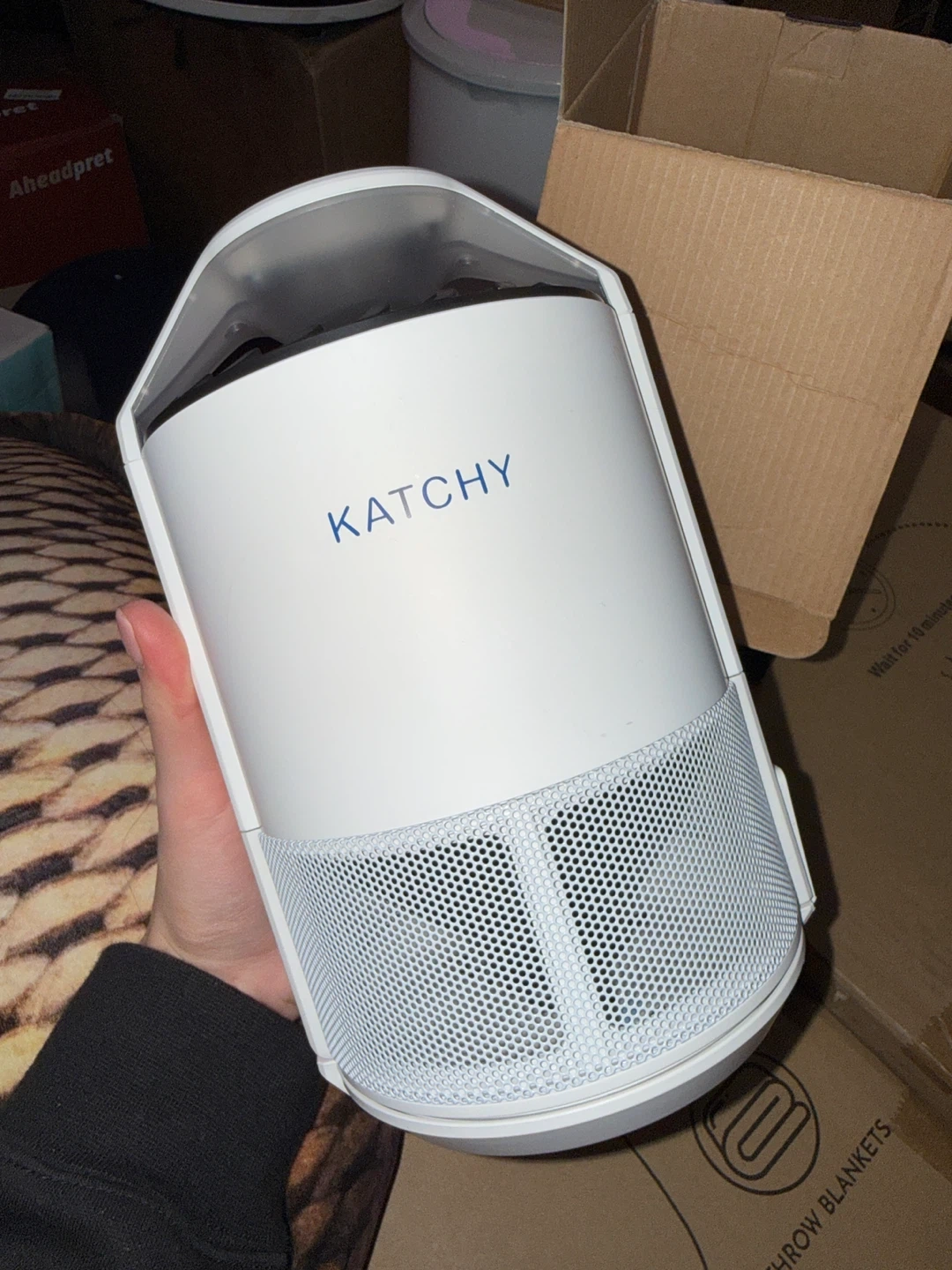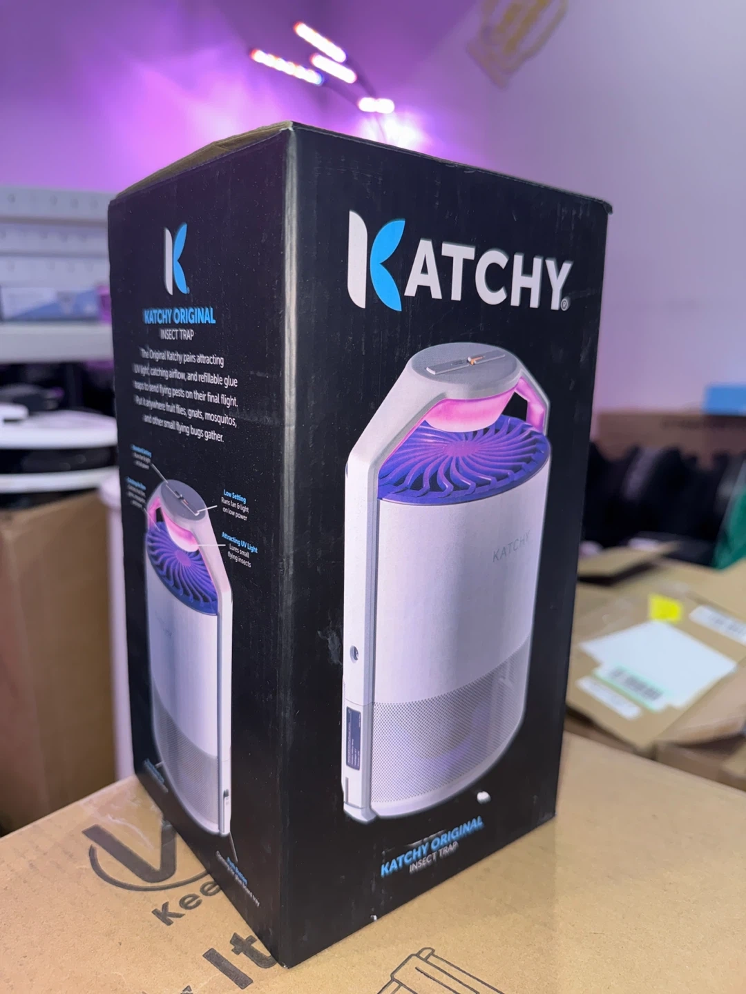 This Katchy Original insect trap uses UV light and a fan to attract and trap flying insects. It comes with five sticky glue boards. It's white and designed for indoor use.