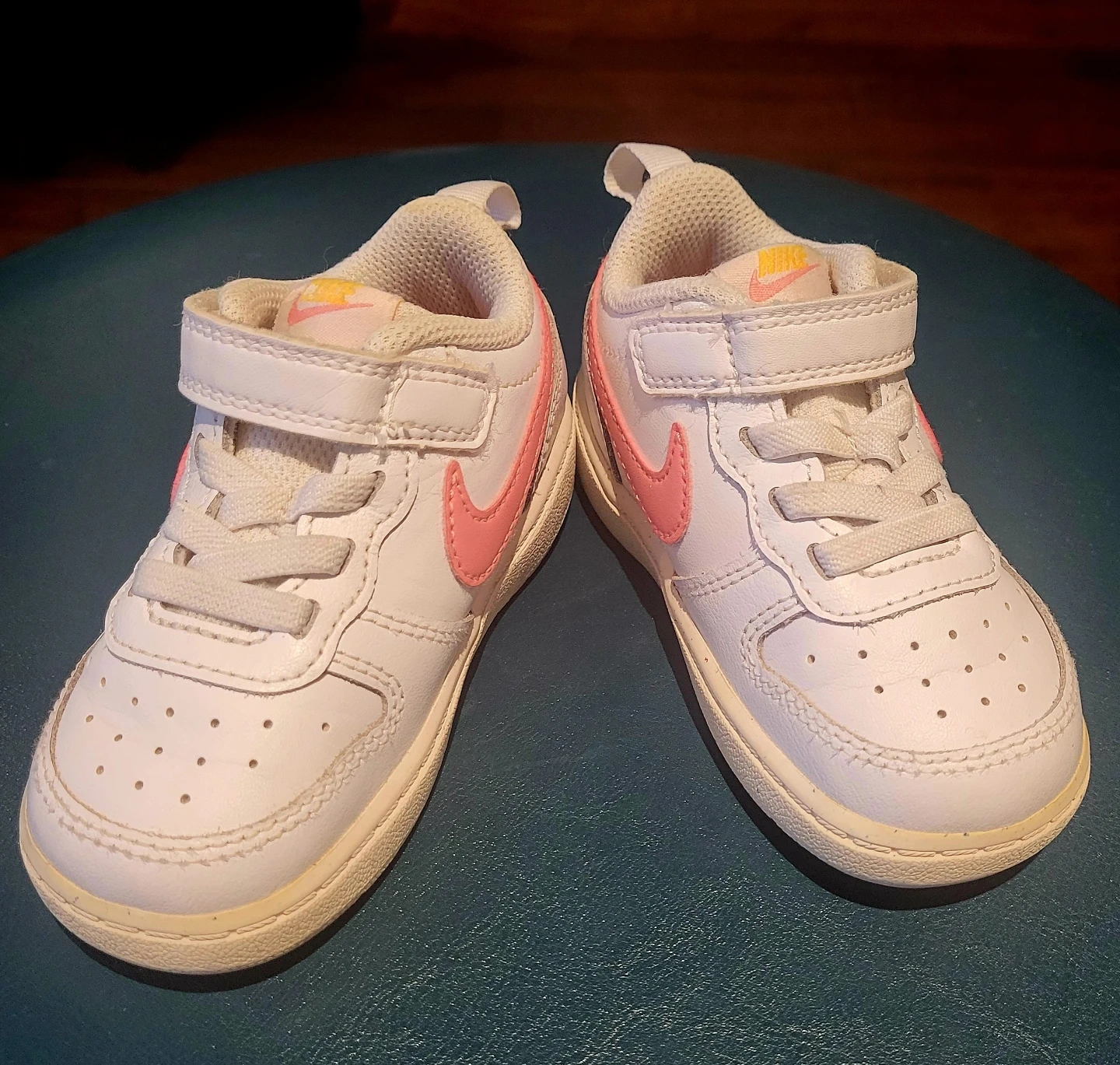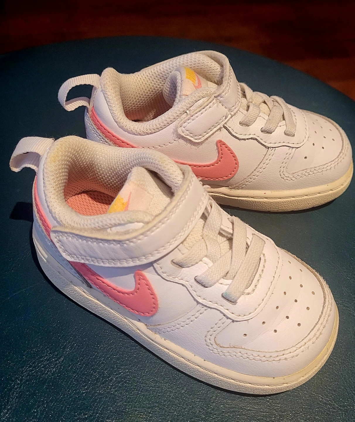 These adorable Nike Court Borough Low 2 toddler sneakers are in very good condition! They feature a classic white design with a pop of pink on the swoosh and heel. Perfect for your little one's everyday adventures. Size 6C