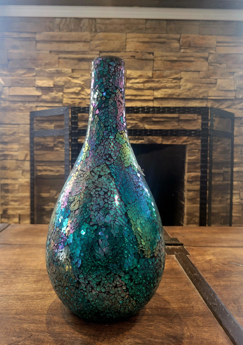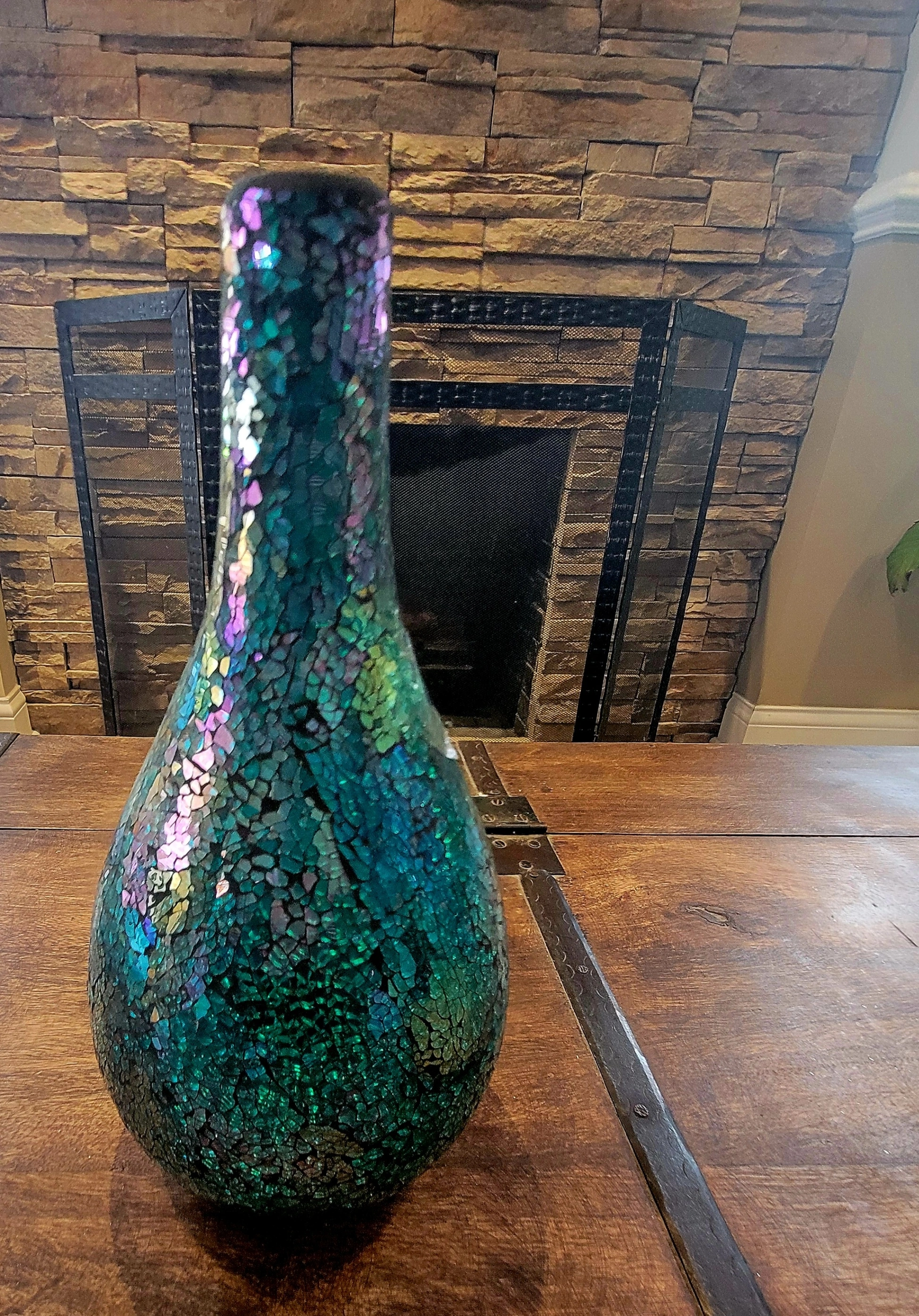 The way the light hits the mosaic glass creates a magical, shimmering effect that shifts between deep teal, emerald green, and vibrant purple. It’s the perfect "wow" piece for an entryway, a sunny windowsill, or as a centerpiece for your next gathering.