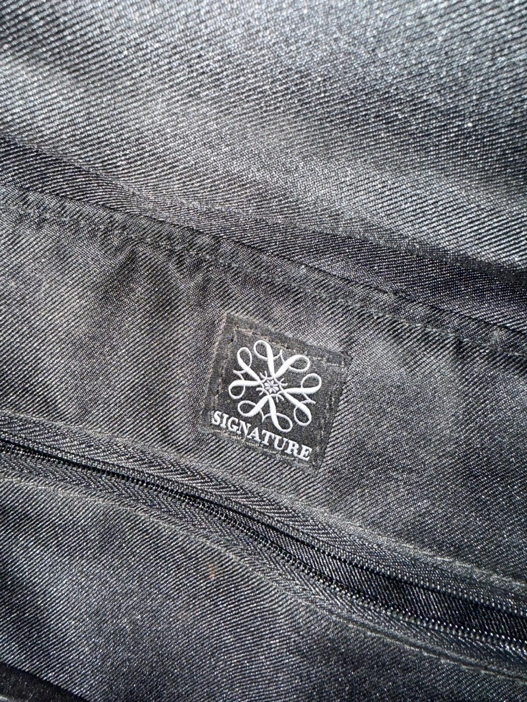 This satchel bag features a classic black and white gingham pattern. It has a secure lock closure on the front flap. The interior has a 'Signature' brand tag.