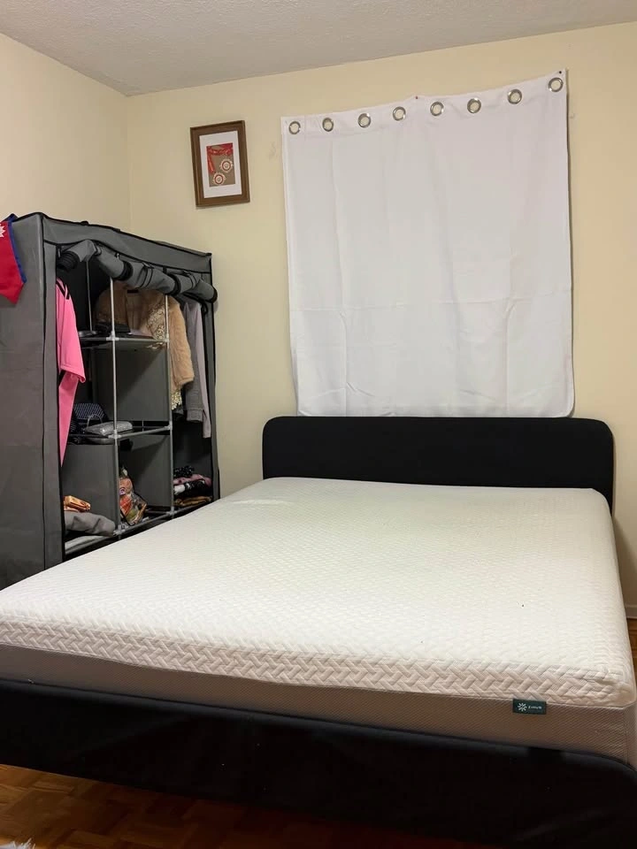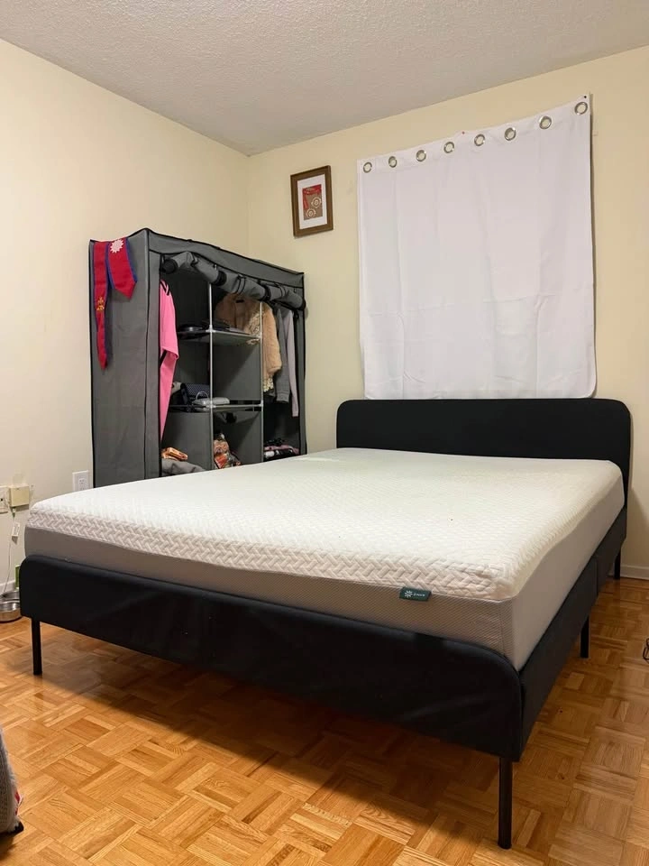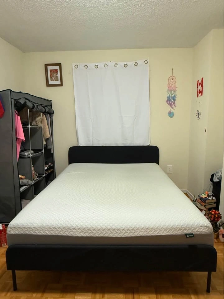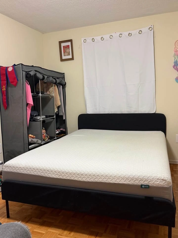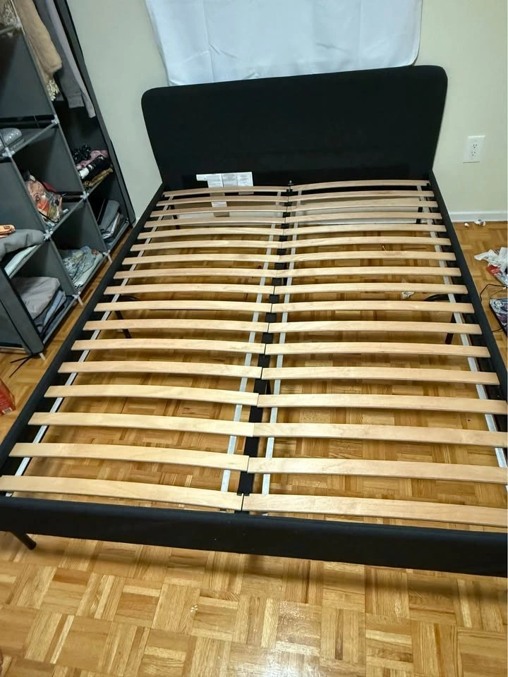 Queen size bed frame for sale. Bought less than a year ago for $179 before tax. Selling for $120. If you need the fluffy blanket and cushion, I can do it all for $180. The original price for the blanket was $89.99 before tax and the cushion was $10. I can give you the mattress for free if you want it. Pick up only!