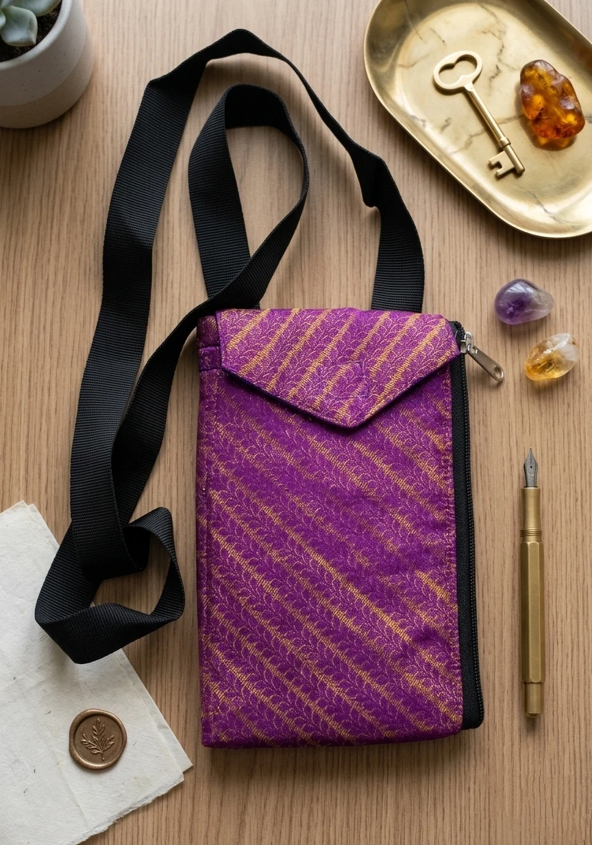This handy phone pouch from Earthy Textiles is great for keeping your device secure and accessible. It features a zippered closure and an adjustable strap for comfortable carrying. Perfect for travel or everyday use!