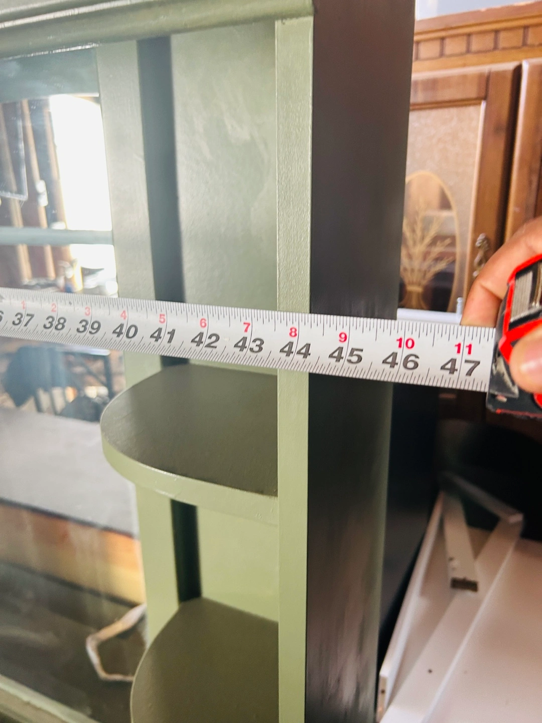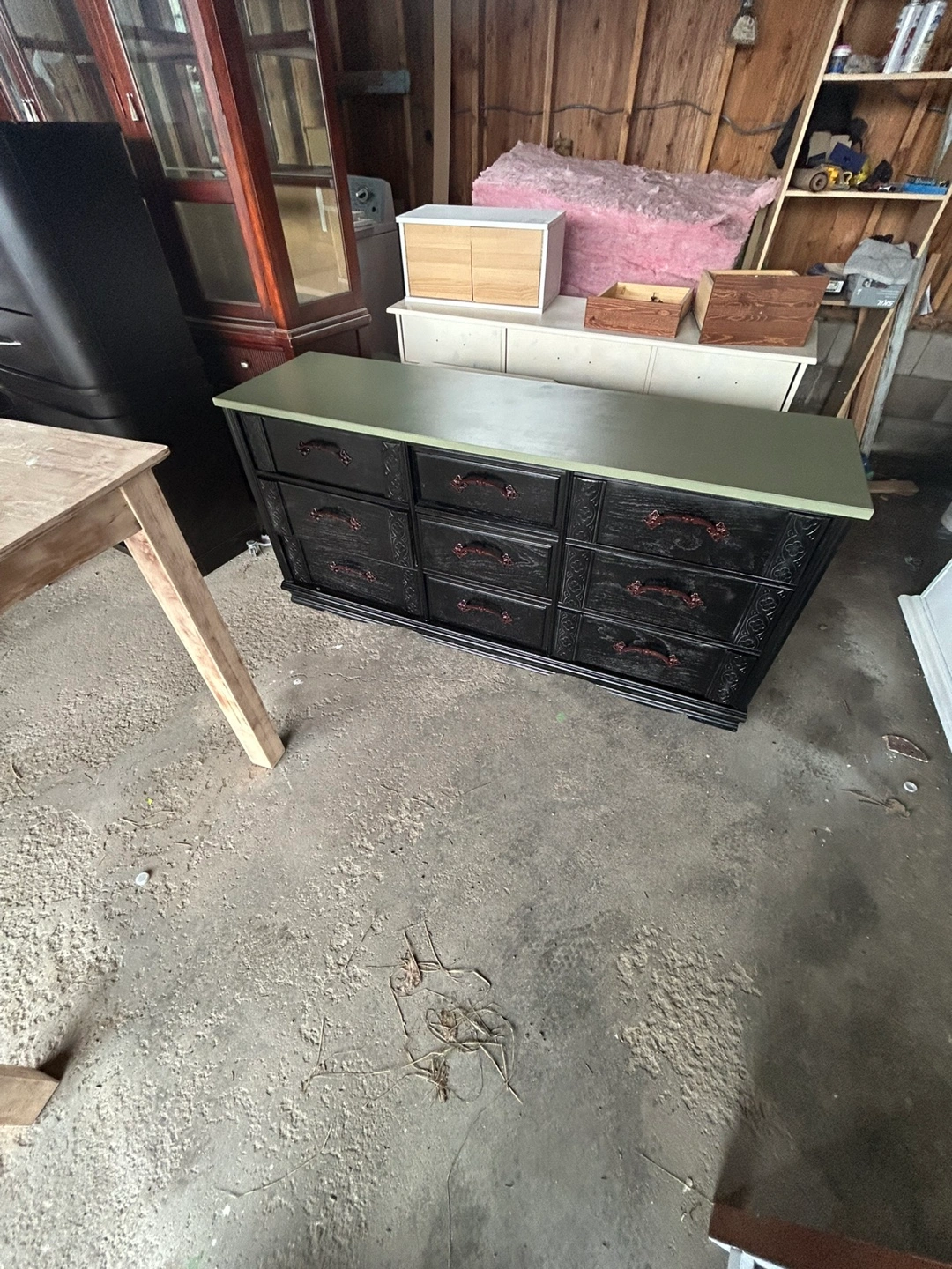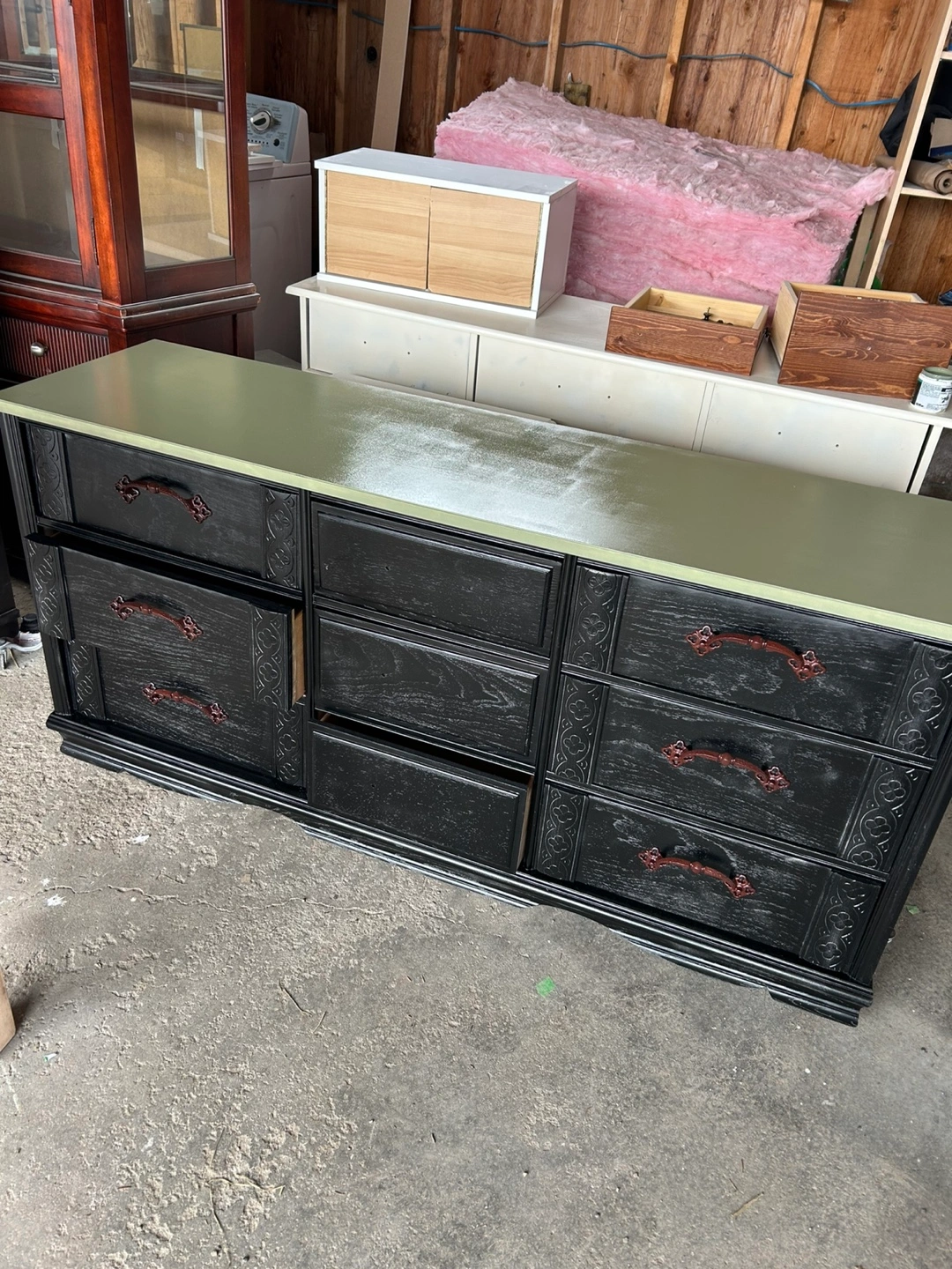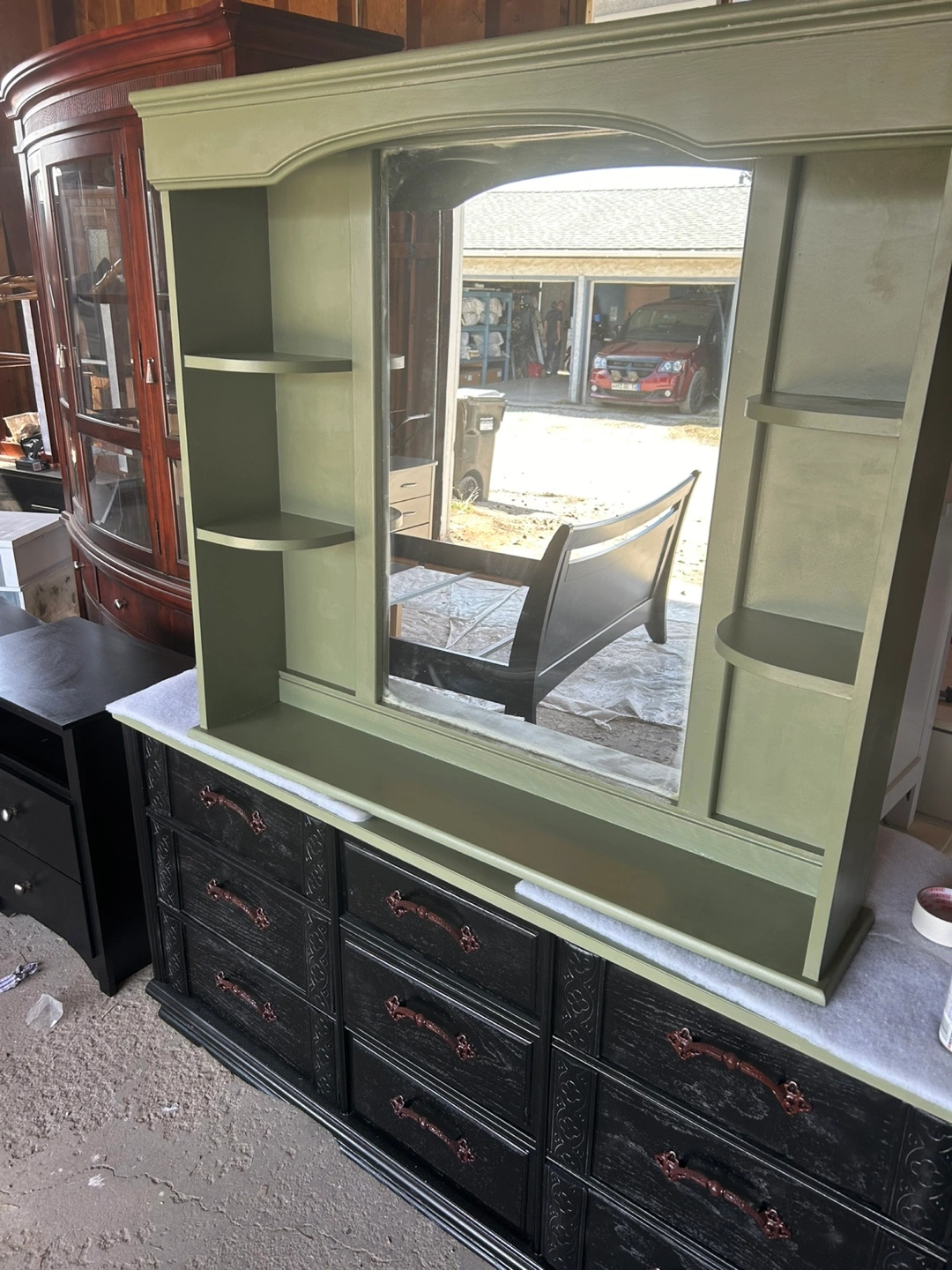 Nine-drawer dresser with matching mirror. Dark-stained wood with ornate detailing. Green painted top and mirror frame. Dark bronze drawer pulls. Excellent storage solution.