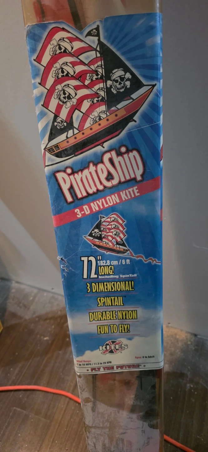 This 3-dimensional nylon kite features a pirate ship design and a spintail. It's 72 inches long and made of durable nylon. This kite is recommended for ages 8 to adult, with a wind range of 7 to 18 MPH.