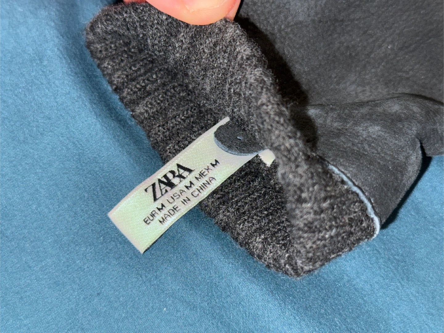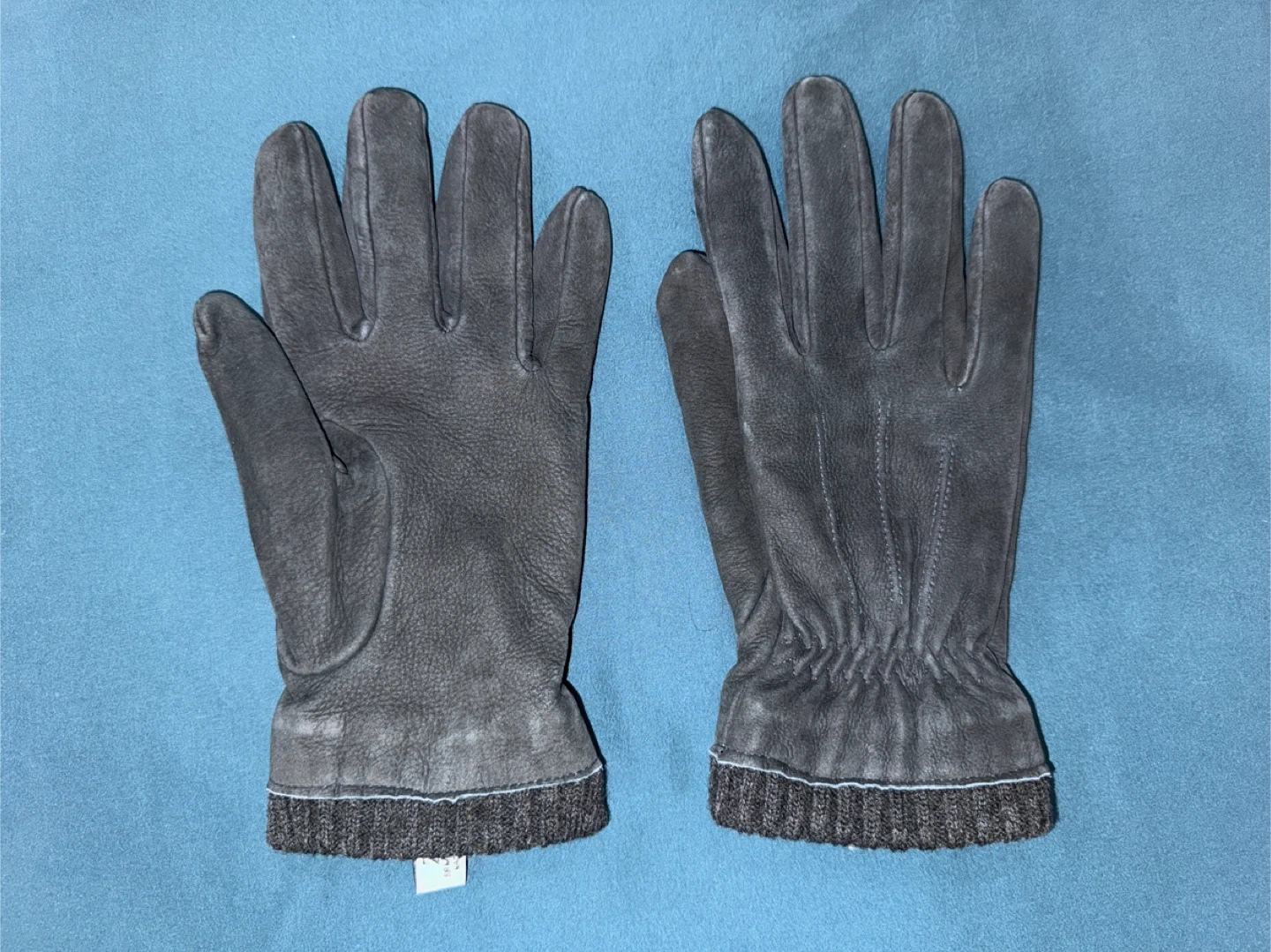 Pair of gray suede leather gloves from Zara with ribbed knit cuffs for warmth. Lightly used, no major scuffs or tears. Soft lining inside. Great for cold weather. Made in China.