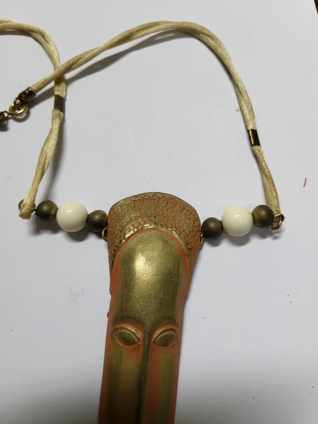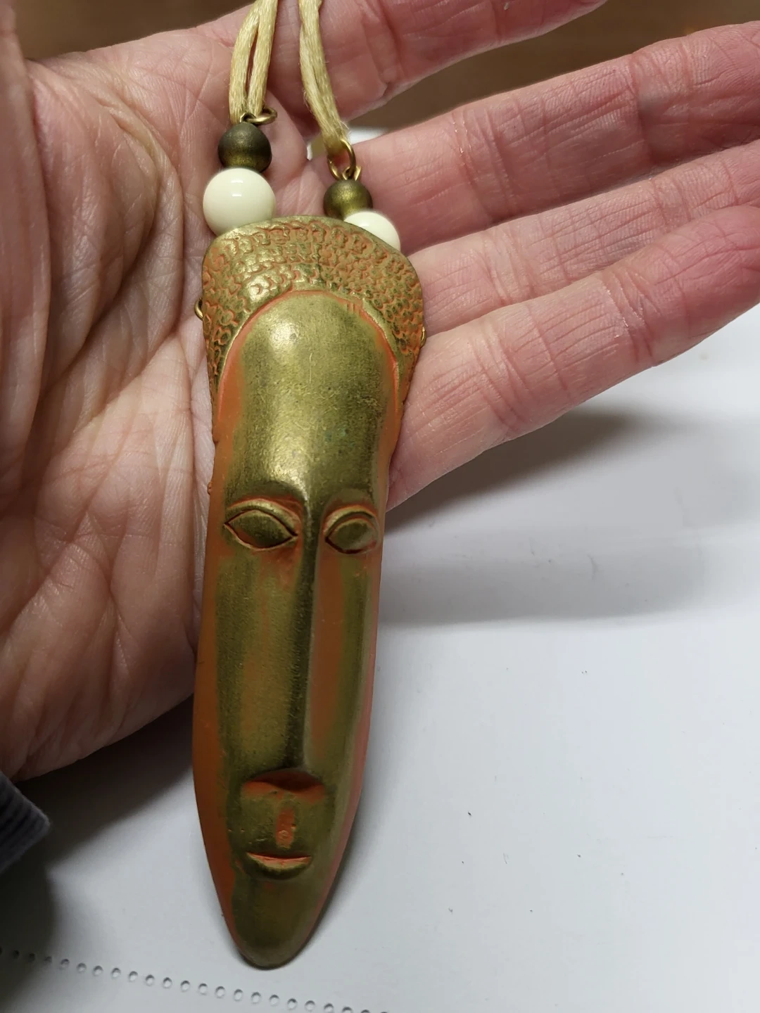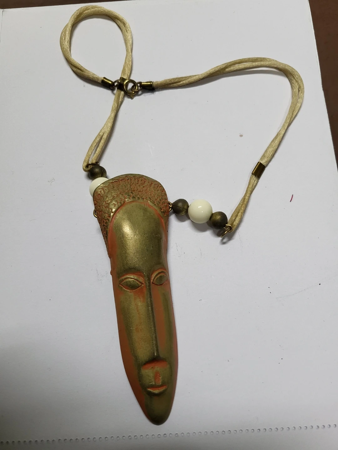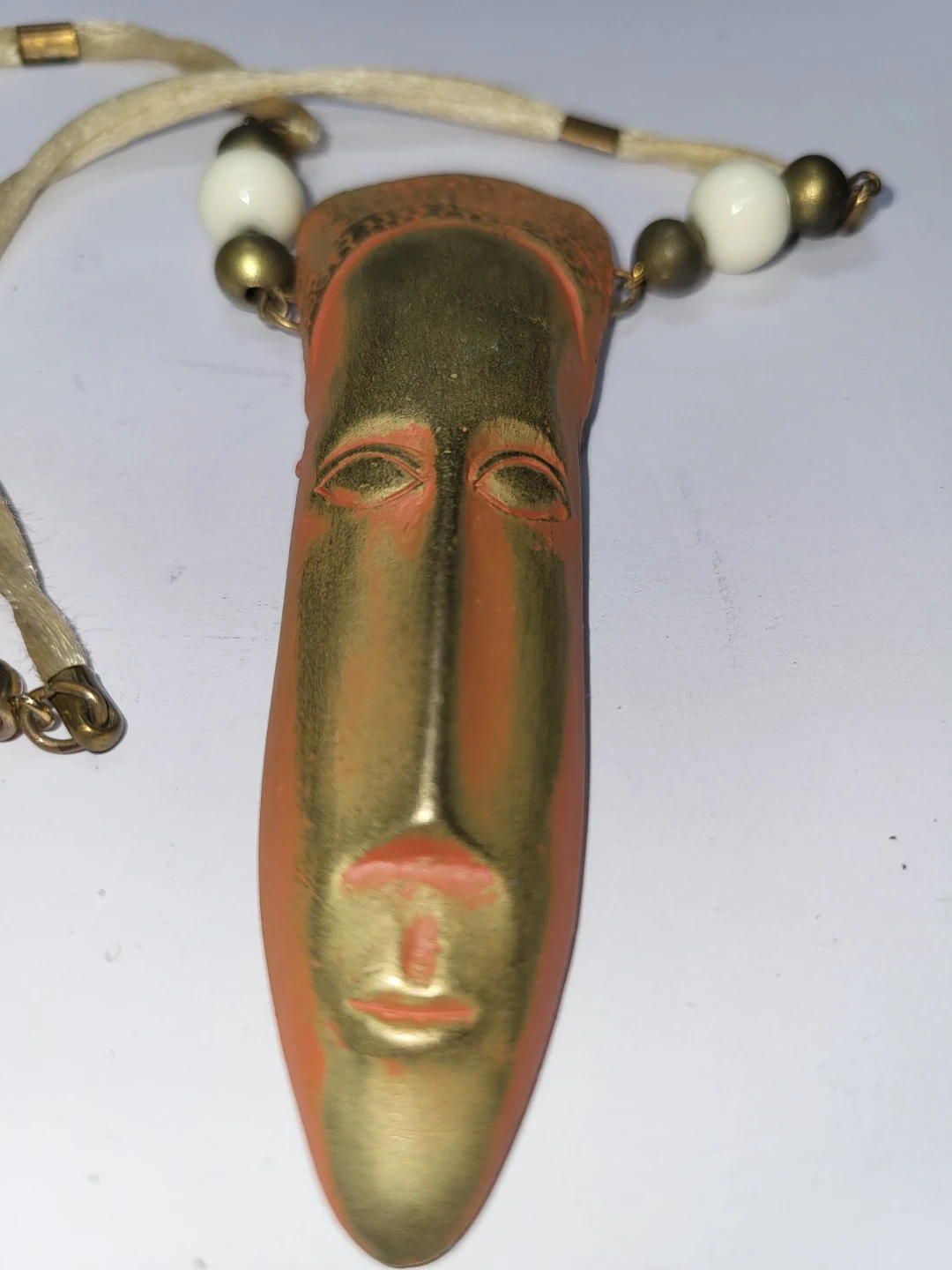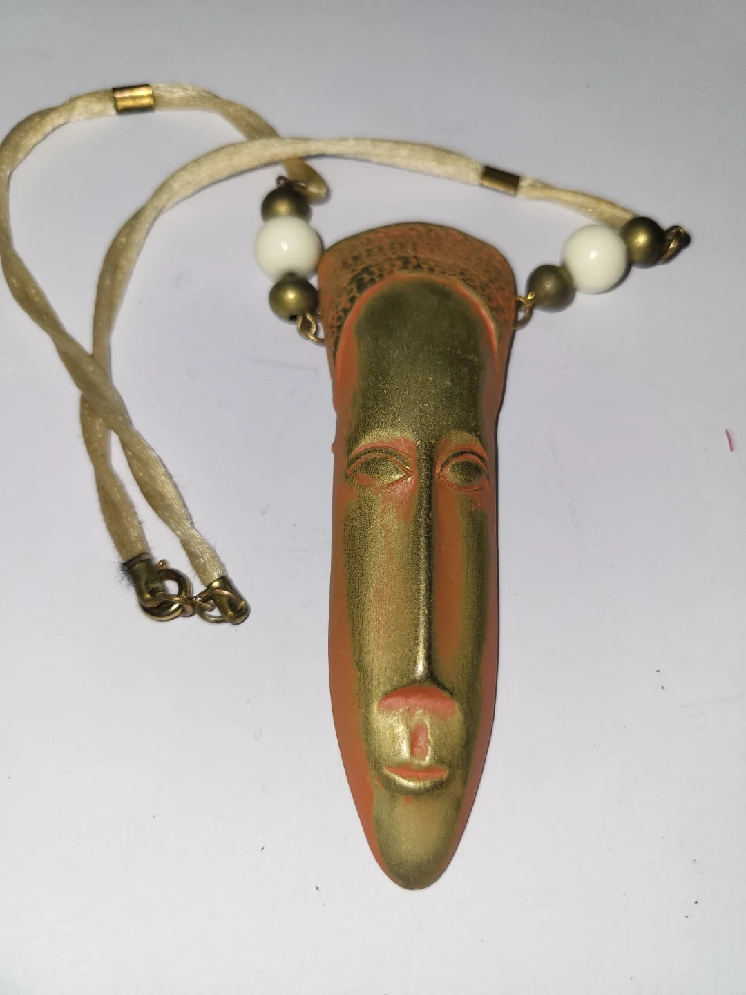 Unique vintage vintage Jonette Jewelry Company (JJ) necklace featuring an African mask design. The pendant has a gold-tone face with an orange hue and is complemented by white and bronze-tone beads on a beige cord. A stylish statement piece!