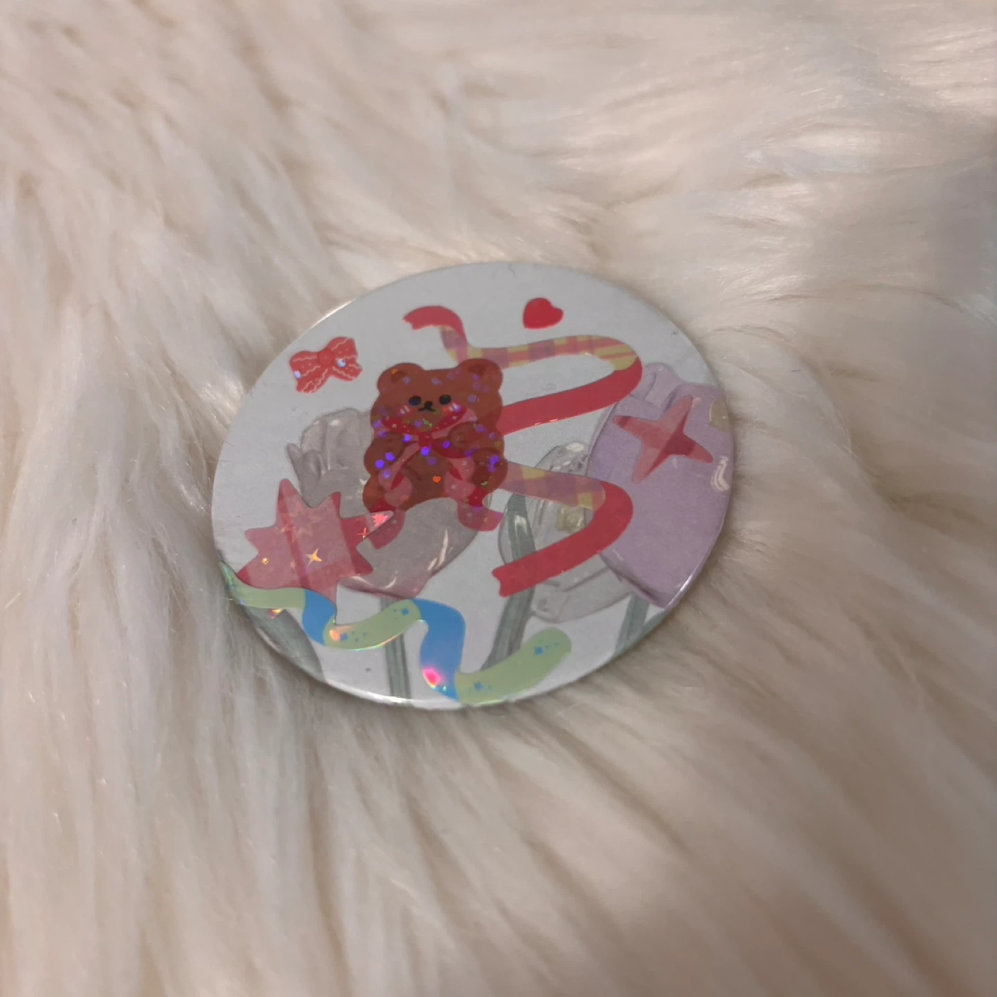 A small, round pocket mirror with a cute design featuring a teddy bear, ribbons, and hearts. It's perfect for quick touch-ups on the go. The mirror is made with a metallic casing and a reflective glass surface.