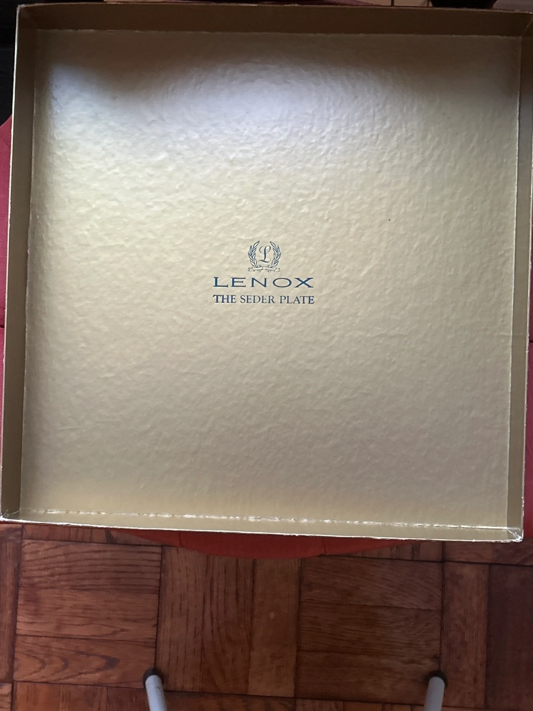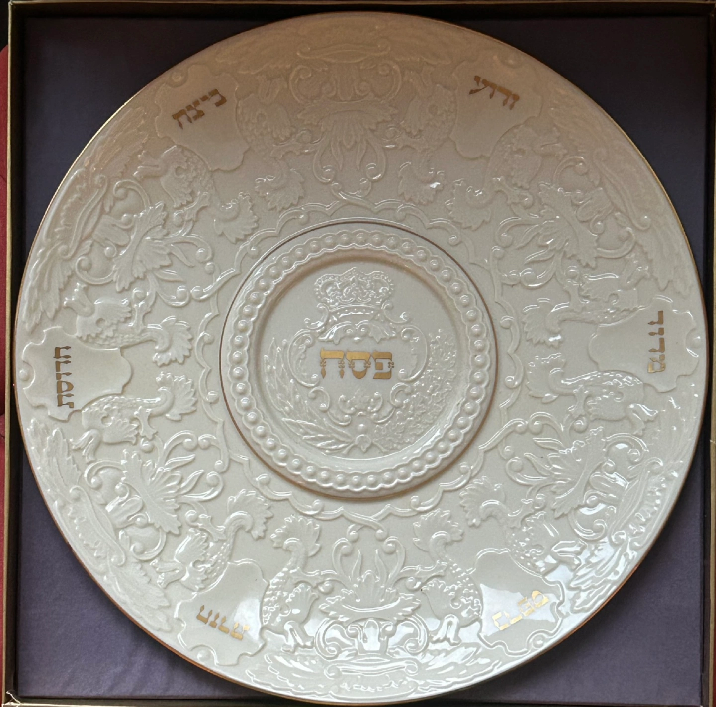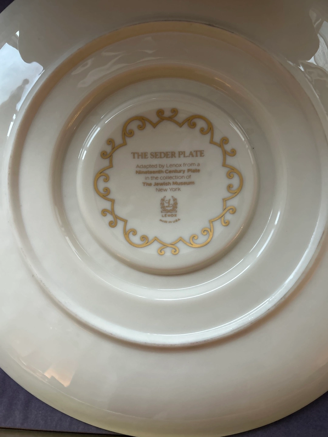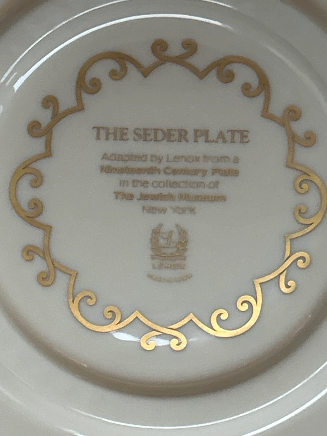 Lenox China USA Judaical Passover Seder ivory plate with 24K gold accents, adapted from a 18th century plate in the Jewish Museum of New York, 1980’s.