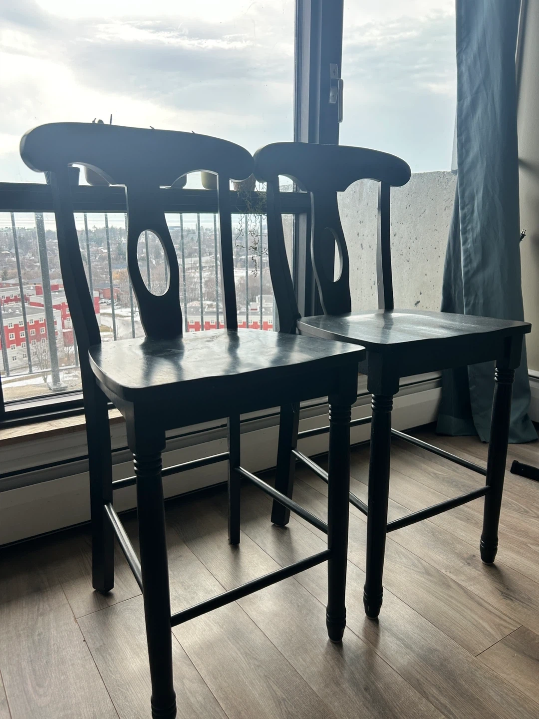 This is a set of two black wooden bar stools. They're made of solid wood with a classic design. These stools are perfect for a kitchen island or home bar!