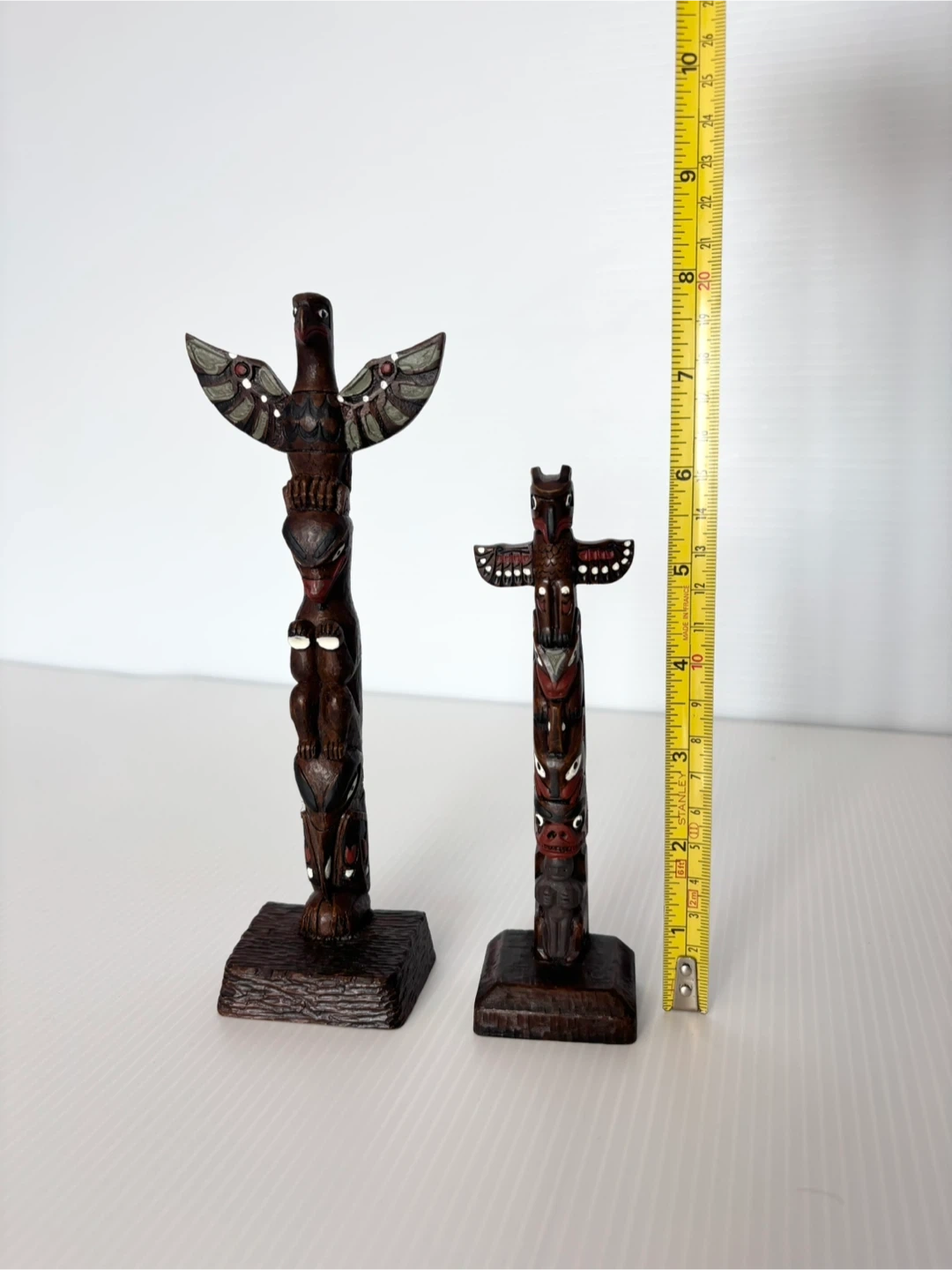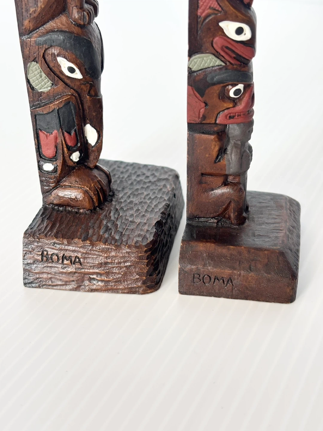 Detailed pair of BOMA carved wood totem poles. Each pole has colorful painted accents. Taller one is 8” tall. Smaller one is 6” tall. Made in Canada