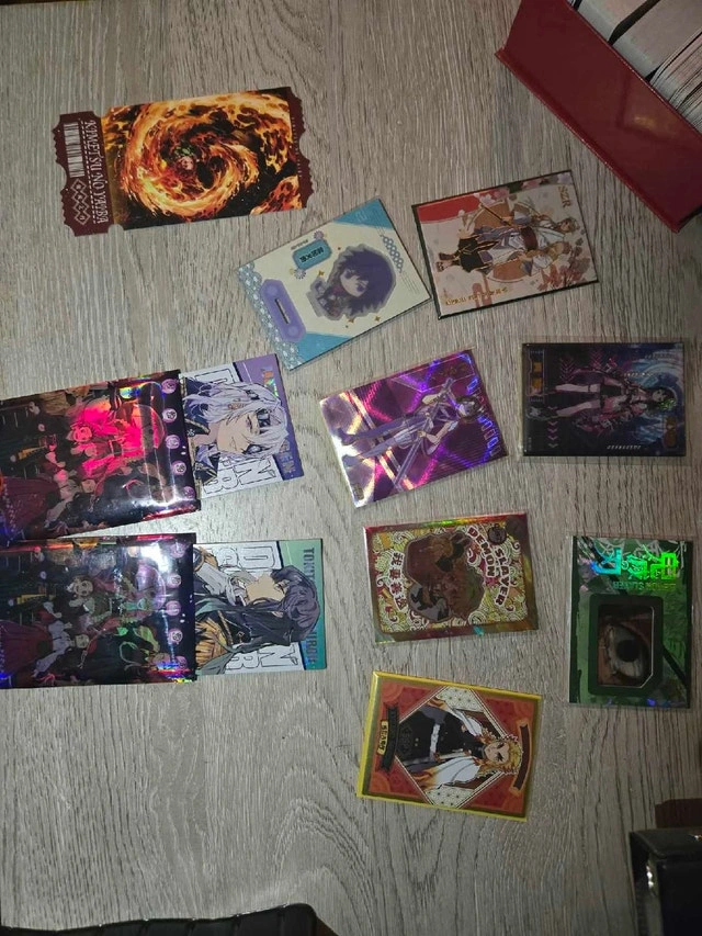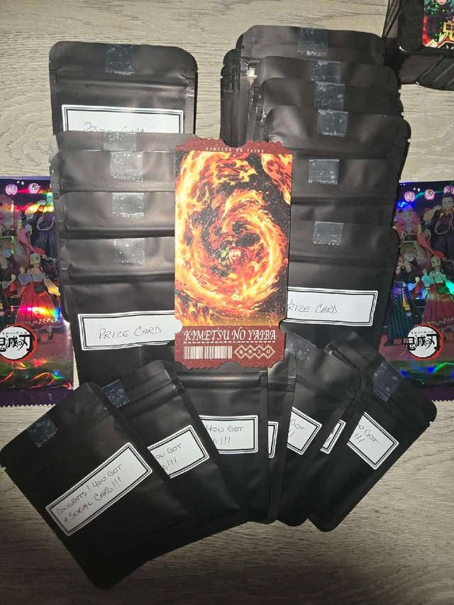 Demon Slayer CARDS!!! 1/5 chance at a SERIAL or TICKET card!!! Each mystery bag will contain 25 cards and 1 surprise hit pack. ONLY 50 made and 7 serials and 3 ticket cards are included in 10 of them. Buy multiple at discounts, buy 5 guarantees a serial hit pack. If you're interested in Demon Slayer cards, I have binders and boxes FULL. Feel free to message for pictures or even inquire about coming by to view the massive inventory yourself! A couple bucks could get you a fair packet of cards for your collection! All are CCG. Very few TCG left (Union Arena, Build Divide) but MASSIVE stock of Little Dino, Carreda, Warpath, CCG etc.